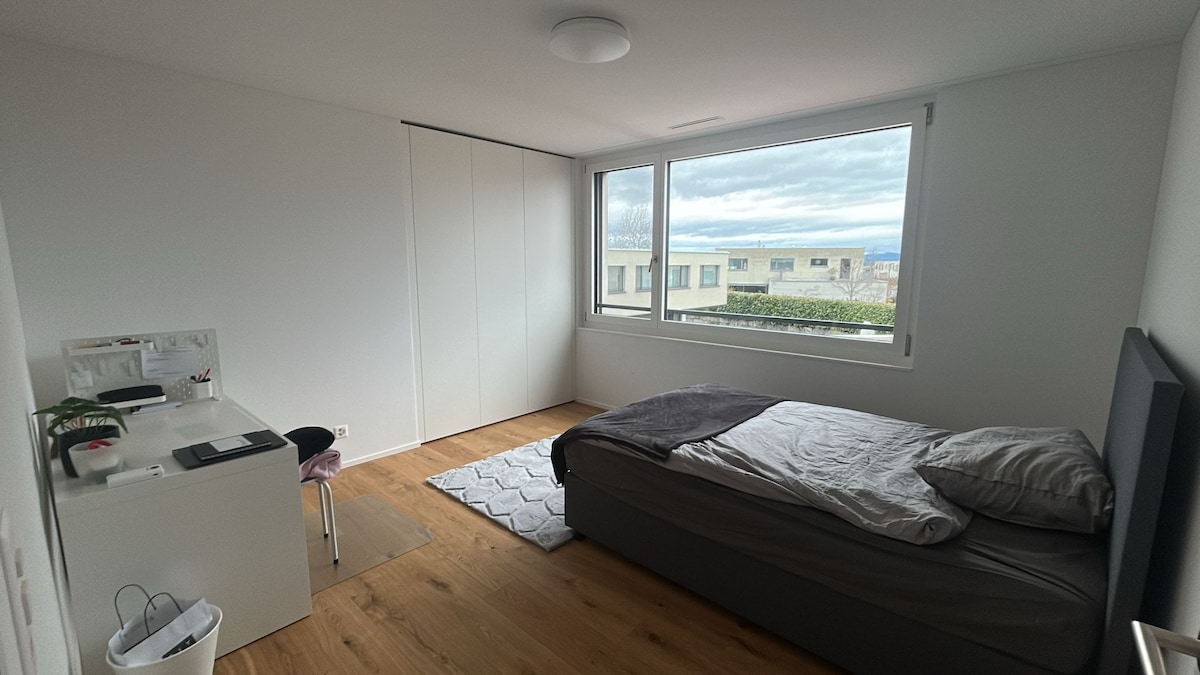 Belo quarto com cozinha separada e área de estar. Vistas maravilhosas para o lago, as montanhas e o campo. Estacionamento gratuito e boa ligação ferroviária (a 5 minutos de distância). O Lago Hallwil e a estância à beira do lago ficam a 5 minutos a pé. Se alguém quiser, temos pranchas de stand-up paddle para alugar. Tem a cozinha, o quarto e a casa de banho só para si e vivemos no andar superior da casa.