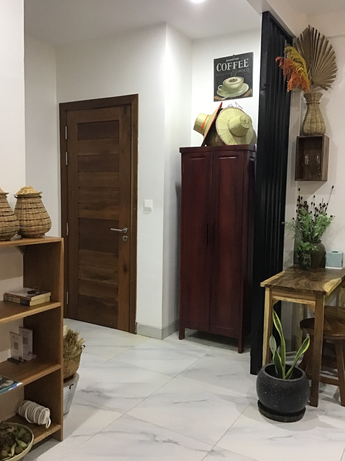 Mobiliário com mistura de Khmer e design moderno equipado com uma ampla gama de comodidades e confortos. A casa tem dois quartos, com sala de estar e espaço de refeições separados. Cada quarto vem com um banheiro privativo, incluindo chuveiro quente e frio. Itens essenciais de banho, chinelos, roupão de banho, guarda-roupa e secador de cabelo são fornecidos. Todas as comodidades necessárias são fornecidas com uma cozinha totalmente mobiliada e ingredientes básicos de cozinha, onde você pode preparar suas próprias refeições durante sua estadia.