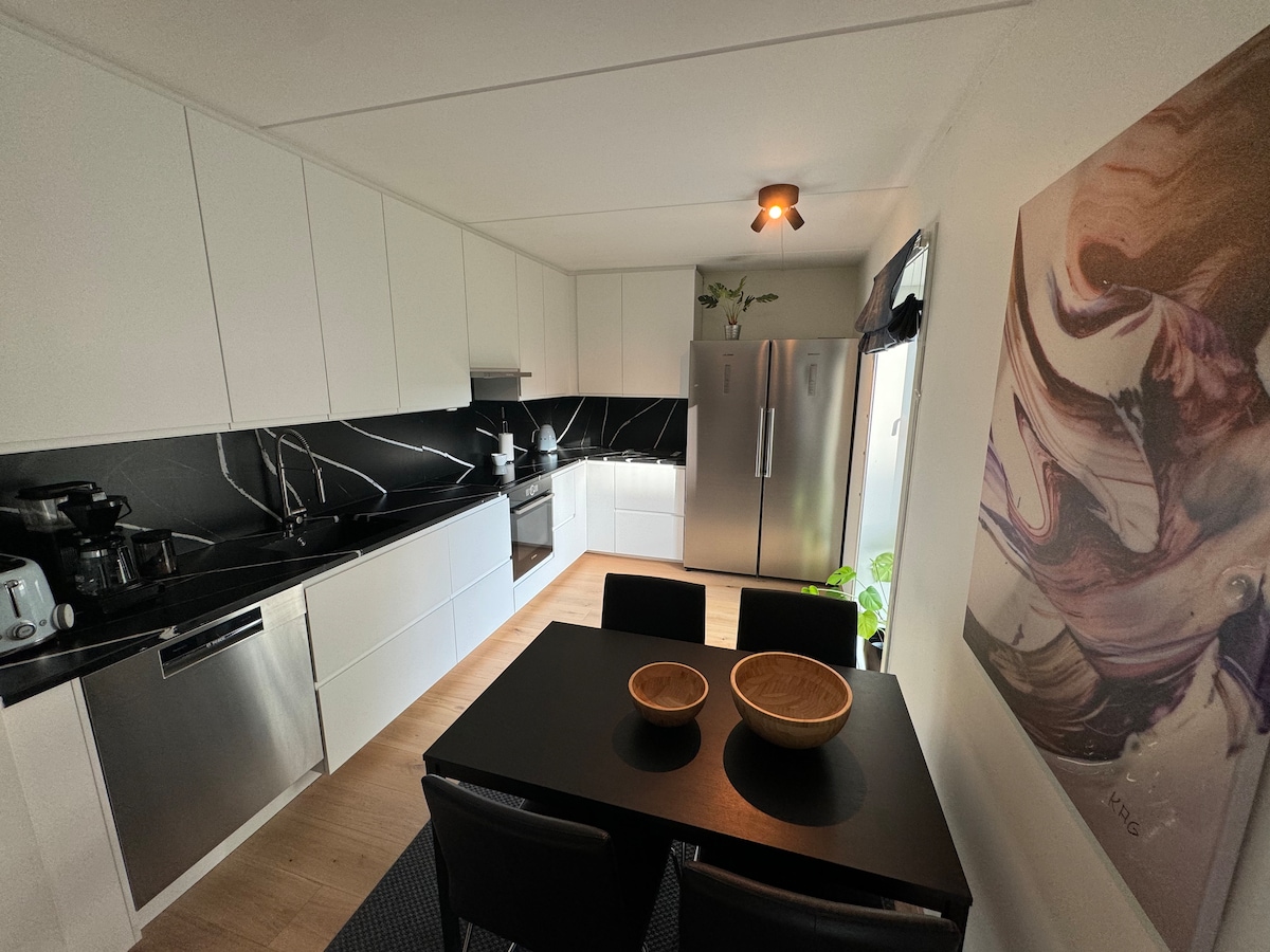 Recém-renovado e moderno, com dois quartos, numa zona tranquila de Byåsen. Quarto com uma cama de casal e um sofá-cama duplo na sala de estar, proporcionando um espaço confortável para dormir até quatro adultos. Apenas 5 minutos a pé do elétrico que o leva em direção ao centro da cidade ou para o campo. O apartamento está protegido e isolado numa zona residencial tranquila. Perfeita para uma estadia tranquila com proximidade à natureza e à cidade. Estão disponíveis carregadores de carros elétricos. Cobrança de uma taxa de 75 NOK por carregamento.