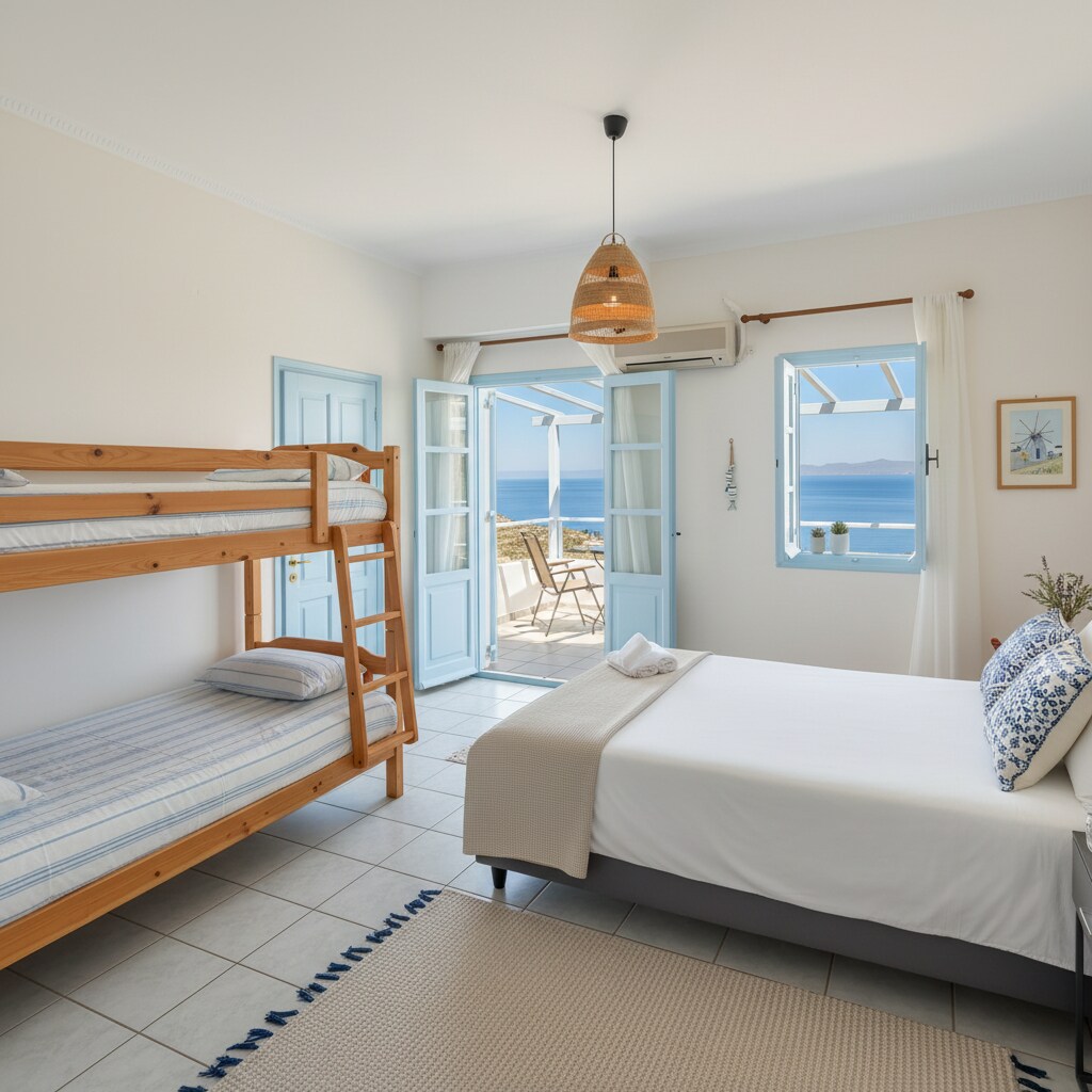 You will be hosted in one of our spacious and stylish apartments (35m²), located above ground level with breathtaking panoramic views of the Aegean Sea and the Cycladic islands. Each apartment features a separate bedroom with a double or two single beds, a living area with a dining table and a sofa that converts into a double/two single beds. A fully equipped kitchenette adds convenience, while the private furnished and covered balcony, offers the perfect spot to relax and enjoy the view.