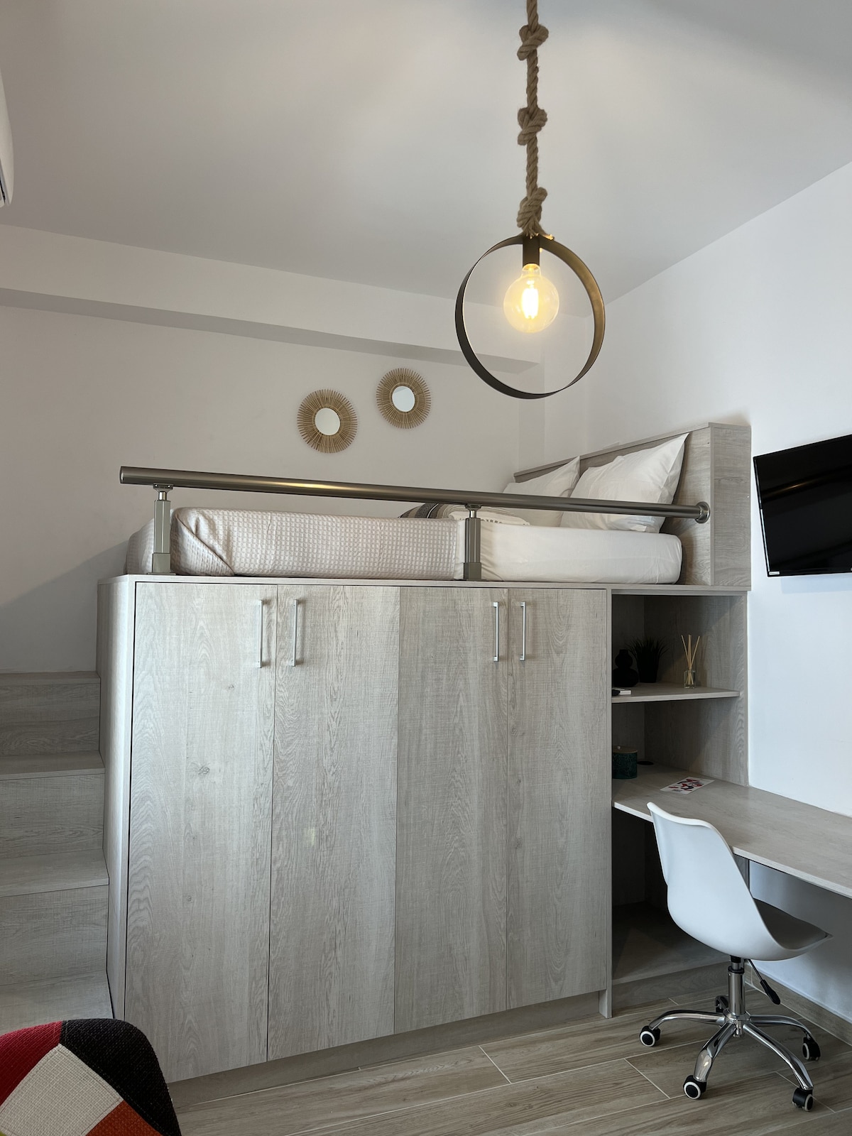 Apartamento de 80 m² recentemente renovado, a apenas 150 m da Praça Miaouli e a 200 m do mar. Oferece uma cama de casal, uma cama individual/de casal e um sofá-cama para até 5 hóspedes. Inclui uma cozinha completa, uma área de refeições e uma área de estar com uma televisão inteligente, uma secretária e ar condicionado. Um espaço espaçoso e confortável perto de lojas, cafés e da praia, perfeito para uma estadia relaxante em Syros.