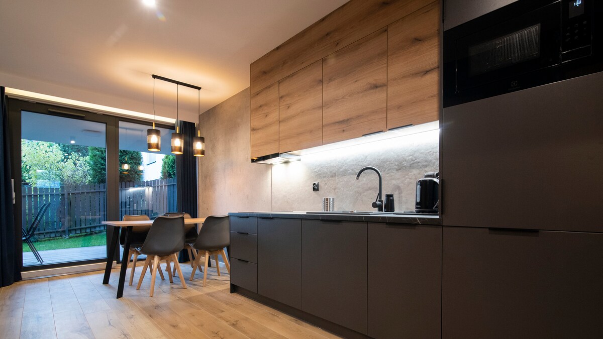Apartament w domu jednorodzinnym na poziomie 0 - z osobnym wejściem. Miejsce idealne na pobyt z rodziną, 3 pokoje sypialnie z TV. Salon z TV SAT. I dużym wypoczynkiem z funkcją spania, aneks kuchenny z pralką i ekspresem do kawy, z bezpośrednim wyjściem na prywatny taras z grilem, dwie łazienki z prysznicem, WiFi. Na zewnątrz taras, odpłatna gorąca balia z jacuzzi, sauna sucha fińska opalana drewnem, dziecęcy drewniany domek, duży parking, teren ogrodzony. Gospodarze zawsze służą pomocą.