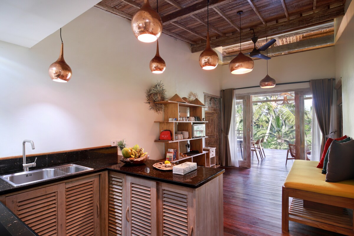 Stay in one of our two exclusive bungalows atop a lush wonderfully secluded valley by the sea on the green peaceful side of the river. Enjoy your complimentary full breakfast with a breathtaking view each morning. Sleep soundly in a naturally cool bungalow with luxurious open air bathroom and porch with nature view. Savour the perfect Bali weather while you dine (or cook) in an open rustic space featuring a breezy upstairs lounge with stunning vista views from valley to volcano to ocean.
