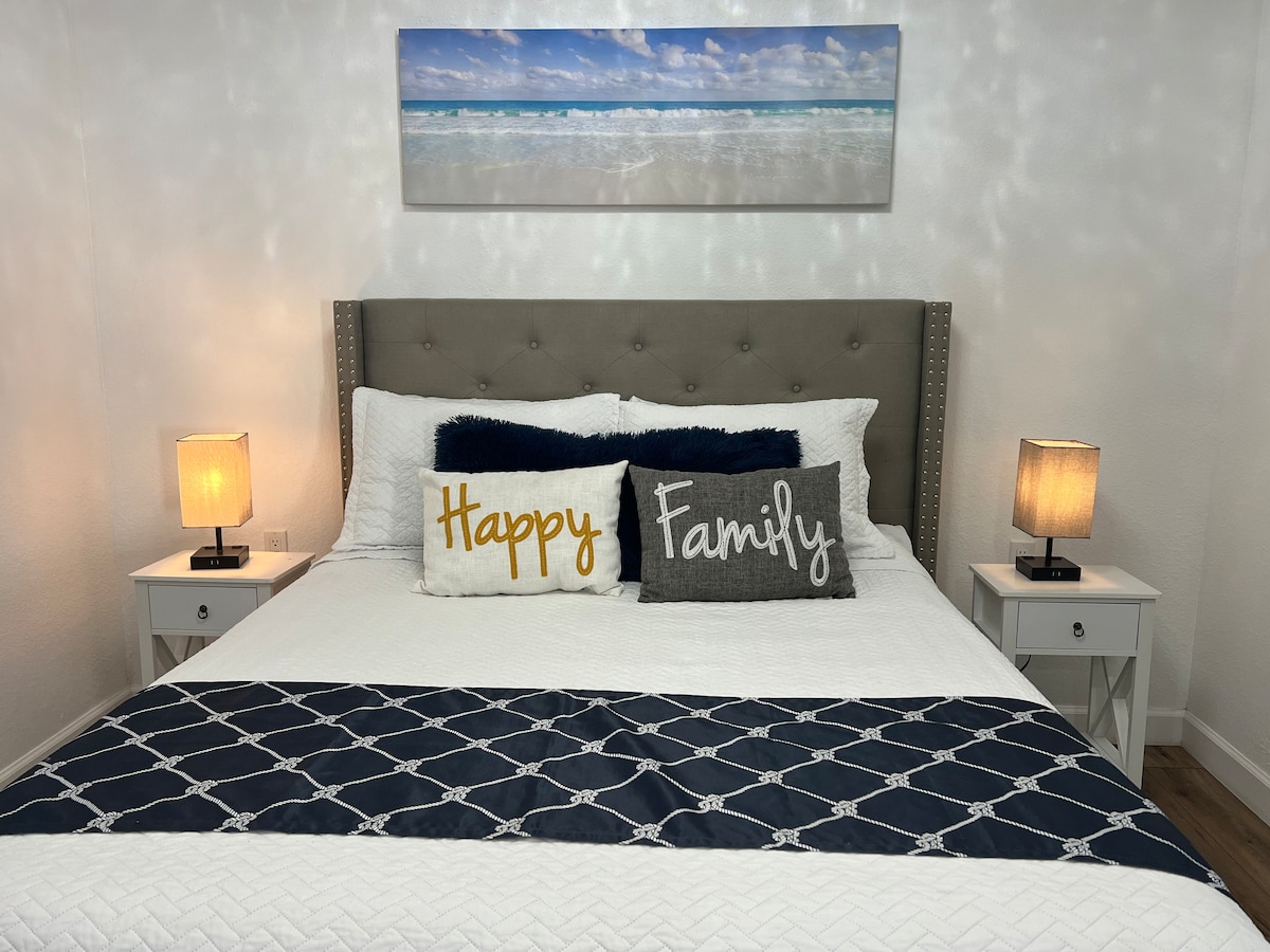 Stay at our renovated beautiful beach styled studio furnishing with a queen size bed as well as a full pull out couch bed. There’s a mini fridge, a two burner electric cooktop, a microwave, a toaster, a tea pot with complementary tea bags, coffee pot with complementary coffee and keurig with complementary Starbucks k cups. Free wifi and a 50 inch tv facing the bed. 2 minutes away from the air port, 10 minutes away from IMG Academy , 30 minutes from Anna Maria Island and siesta key .