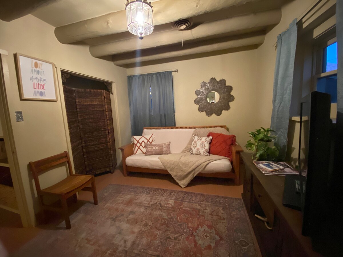 LUGAR PERFEITO PARA UMA ESCAPADA! Uma unidade de um quarto para não fumantes tem muita personalidade. Passeie até a Plaza e os restaurantes. Desfrute do pátio privativo fora do quarto ou do belo pátio com fonte relaxante e muitos bancos. Ideal para leitura, pensamento ou meditação. Muitos hóspedes têm "trabalhado em casa com uma visão diferente"! Um cão de família (menos de 25#) está OK – e você deve perguntar com antecedência. O paraíso aconchegante é uma combinação da vibe Taos com toques contemporâneos.