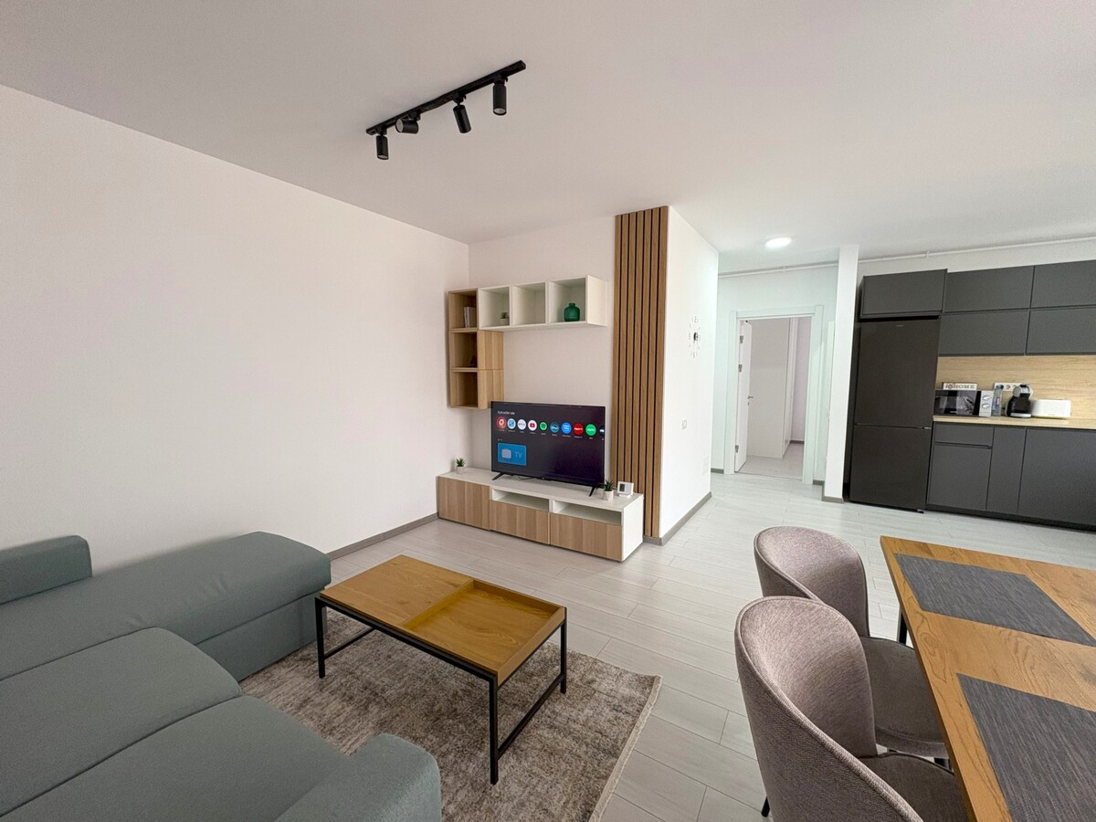 Ultramodern fully equipped apartment with private parking and smart lock for check in / check out. It is located in brand new residential area - Cartier Coresi, near the Coresi Shopping Resort, at 10 minutes from the historic center. It has a bedroom with queen size bed, living room with expandable sofa bed, fully equipped kitchen, air conditioning, large terrace with hammock, washing machine / dishwasher, two 4k TVs with Netflix and HBO Go.