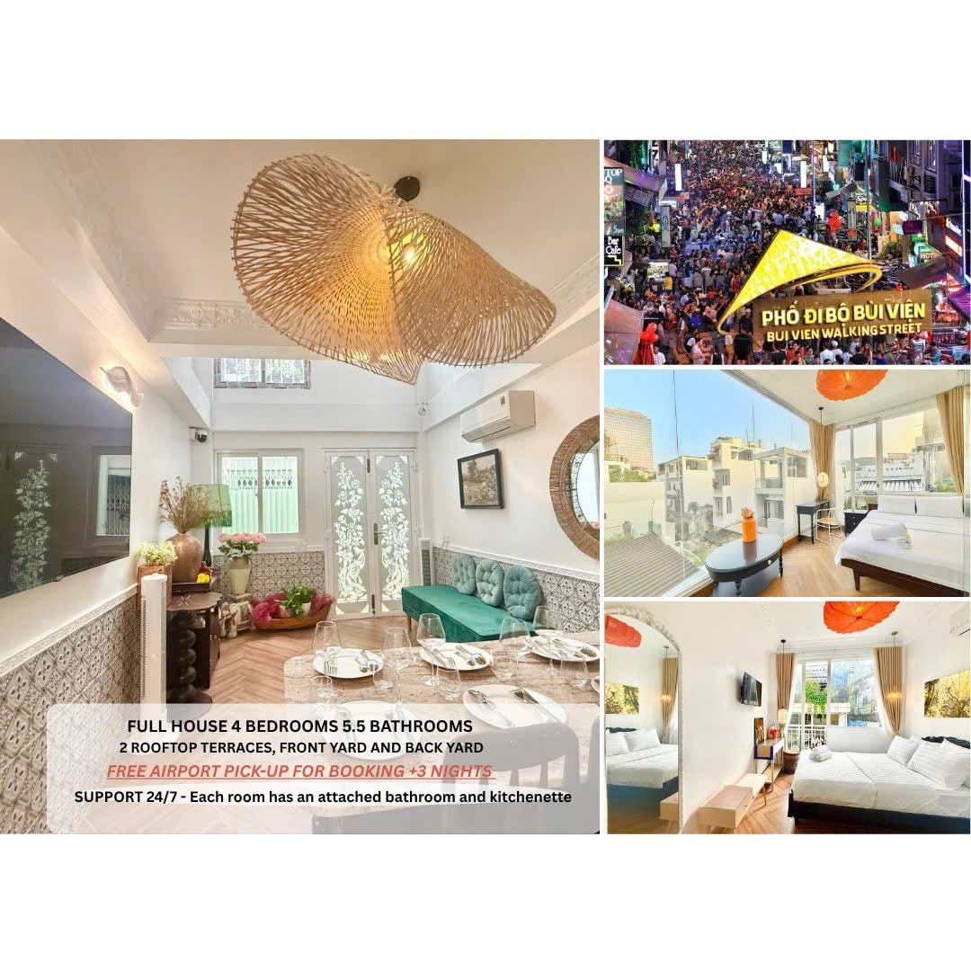 Wellcome to BRAND-NEW house charmingly designed in Indochina style located in the high frequency of BUI VIEN walking street in D1, artistic style, resort facilities, spacious air-conditioned living room WHERE YOU CAN HANG AROUND UPTO 10 PERSONS in 2 large sofas and chairs. Windows, balconies and rooftop terraces have a panoramic view of the whole city. A unique, luxurious house in BUI VIEN walking street but nested in a short alley so there is no noise for caressing your peaceful sleep.