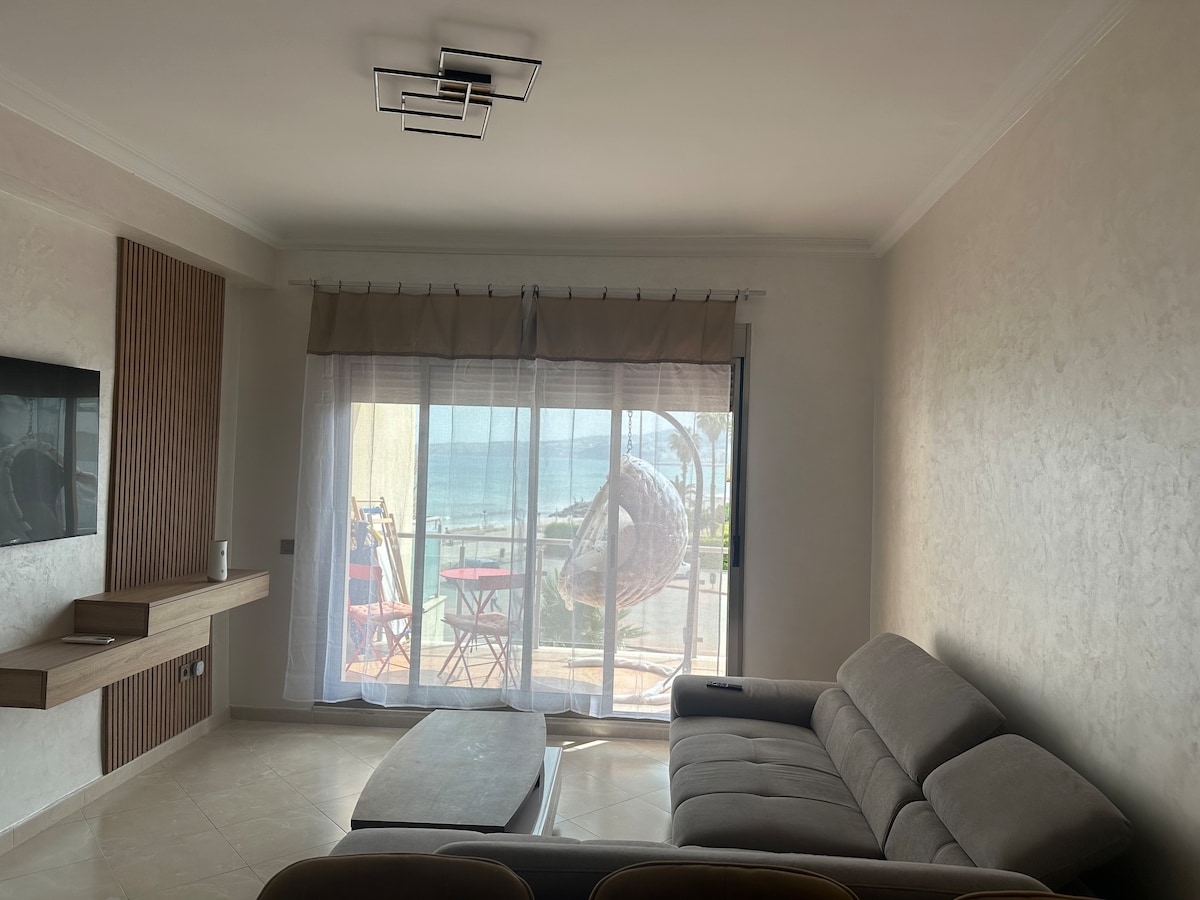 Localização n °1 em TANGER! Praia em frente com uma grande varanda com vista parcial para o mar. Melhor localização em Tânger. Televisão por satélite-WiFi Fibra, Netflix, Iptv. Tudo é acessível a pé: marina, cidade velha, McDonald's, pubs, cafés... Os viajantes com carro terão uma vaga de estacionamento gratuita na garagem do prédio com acesso direto ao apartamento. Segurança 24h/24. Seja meu viajante. * Antes de reservar, leia atentamente a minha descrição OBRIGADO🙏🙏