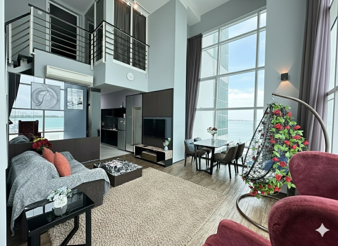 Enjoy a high-floor seaview duplex suite at Maritime Suites, Georgetown — ideal for families, couples, or short stays. Wake up to beautiful sea views with easy access to Penang’s heritage sites, cafes, and shopping malls. This bright seaview duplex offers a comfortable living area, cozy bedrooms, and a fully equipped kitchen. Guests enjoy access to a swimming pool, gym, and 24/7 security, near Gurney Drive and key attractions — perfect for a relaxing seaside stay in Penang.