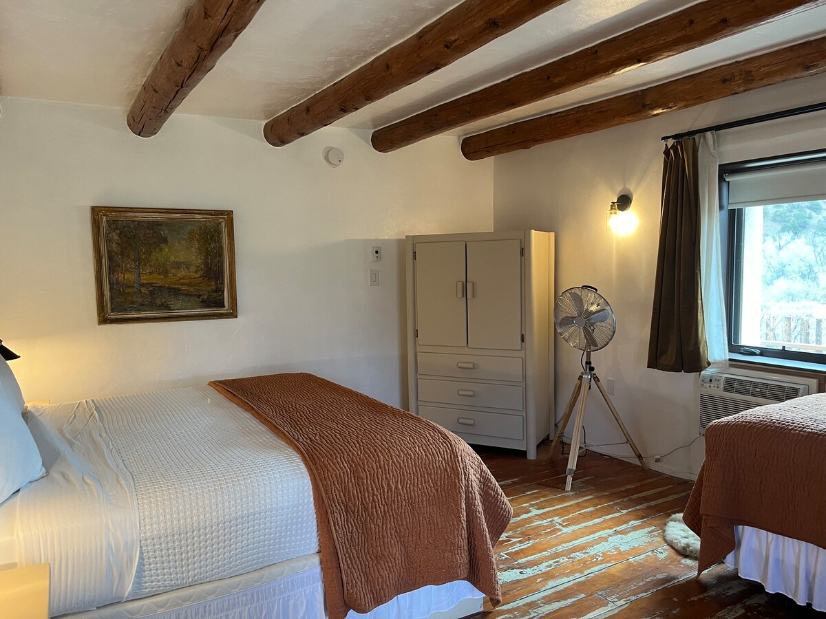 Desfrute de 3 acres de paz e sossego a apenas 2 km da floresta nacional Kit Carson e a 5 minutos da Taos Plaza. Esta é uma propriedade histórica perto da natureza. Nosso objetivo é fornecer quartos tranquilos, calmantes e meditativos usados principalmente para dormir. Não há funcionários no local. Não há áreas comuns internas, microondas e TVs nos quartos. A área da piscina é reservada para aluguéis de retiro, mas esperamos que você aproveite seu quarto, a fogueira e o terreno.