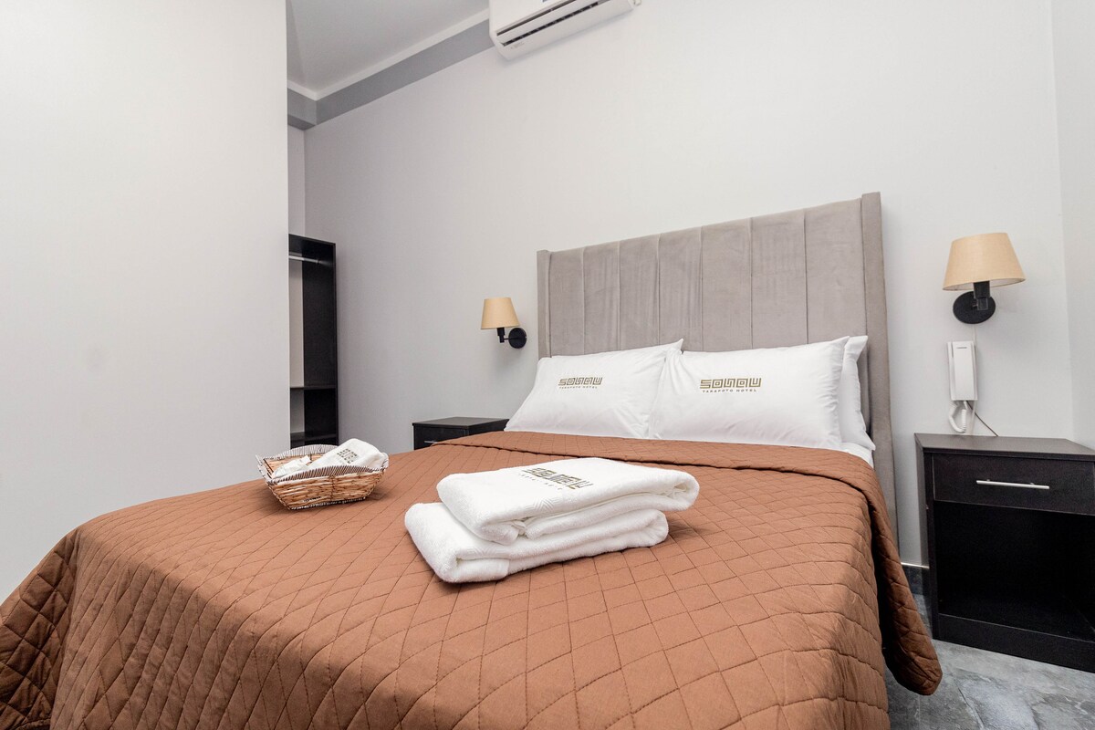 Quarto independente confortável com 23 m². Tem uma Smart TV de 32" com ligação à Internet e TV/cabo, um minibar, ar condicionado para os dias quentes e vista para os jardins. A tarifa do quarto inclui pequeno-almoço, além de poder utilizar as nossas áreas comuns: piscina, garagem, zona de rede, Wi-Fi, restaurante e serviço 24 horas. A CasaBosque é o melhor lugar para relaxar e conectar-se com a natureza a apenas 5 minutos do centro de Tarapoto. Ficamos a aguardar a sua visita!