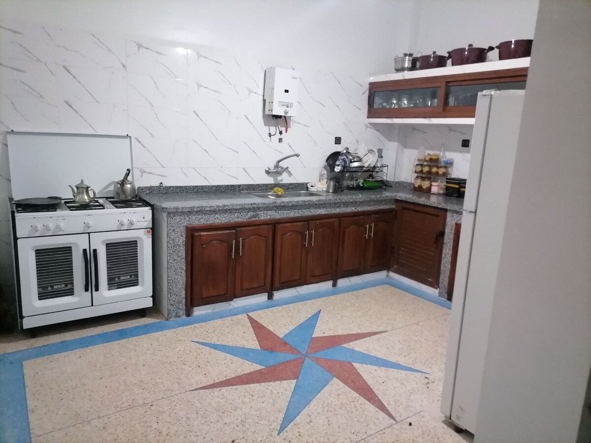 Apartamento muito bonito mobiliado em estilo marroquino, cozinha equipada, sala de estar, sala sala de jantar, um quarto, banheiro, um terraço muito grande com churrasqueira, Wi-Fi, ar condicionado reversível, perto de lojas em uma área tranquila, estamos a 2 km do centro da cidade, possibilidade de fornecer um berço. Lavamos sua roupa gratuitamente. Você também encontrará produtos básicos para cozinhar Eu moro no andar térreo e estou ao seu serviço se você precisar de alguma coisa 🙂