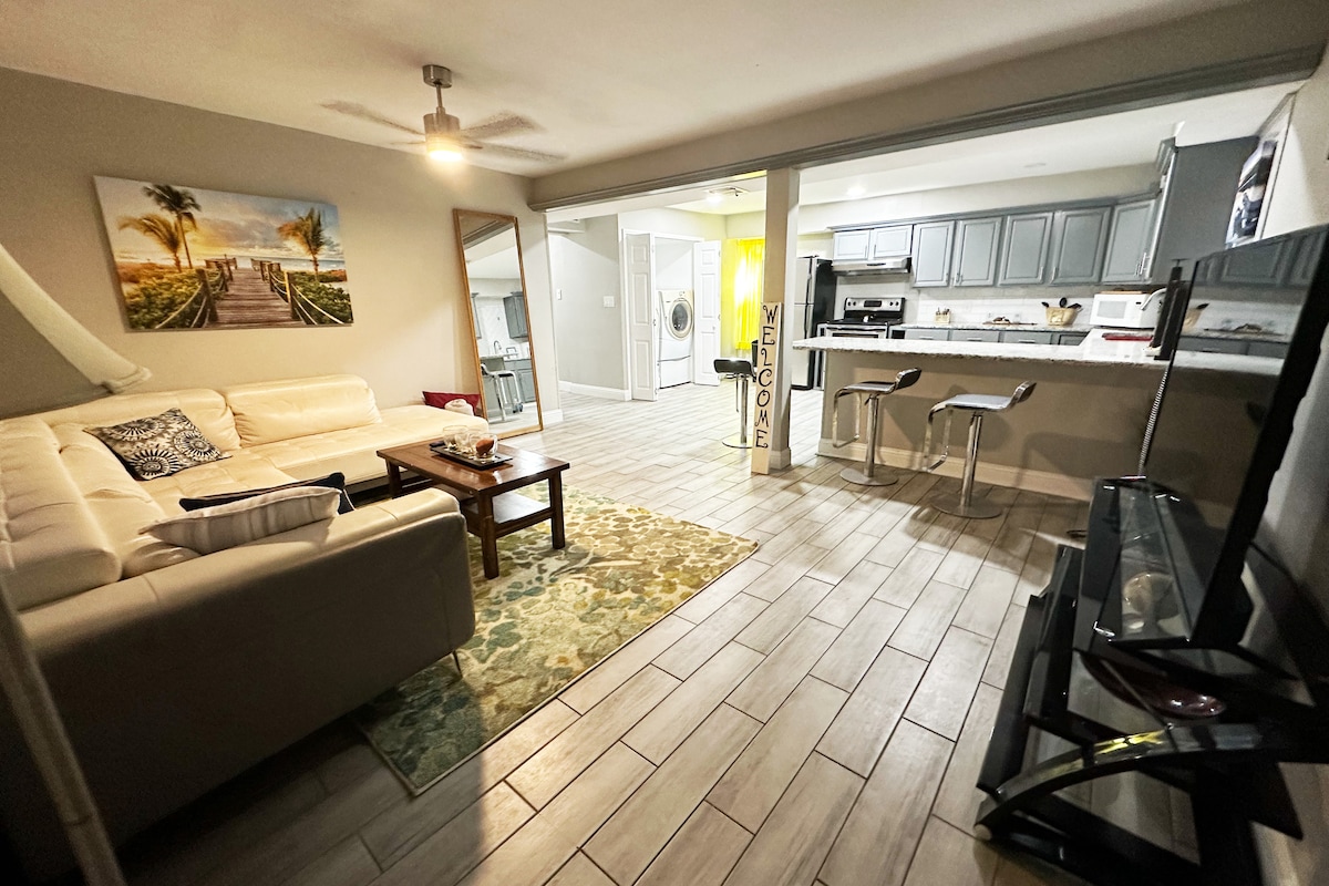 Aconchegue-se neste apartamento recém-renovado. De 4 a 5 pessoas podem desfrutar deste espaço único e muito apreciado. Oferecemos duas camas queen e dois sofás dobráveis de tamanho completo! Um quarto está localizado no piso térreo com um adicional na cave privada. Seria ideal para uma pequena família ou um pequeno grupo de amigos próximos. A casa de banho é pequena, mas é uma casa de banho completa com chuveiro de entrada. Estamos mesmo em frente ao Lockheed Martin! Também estamos a 13 minutos do centro de Forth Worth.