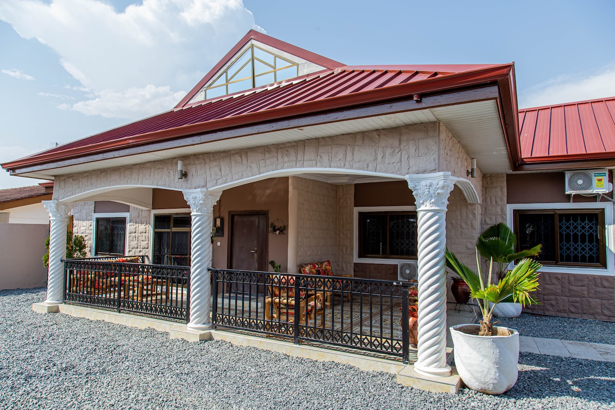 Bem-vindo à sua casa longe de casa na Tema Community 3 - um Airbnb construído especificamente e concebido para o seu conforto e segurança. Localizada a apenas 35 minutos de carro do Aeroporto Internacional de Kotoka, esta propriedade serena oferece um ambiente seguro com vigilância por CCTV e um gerente no local. Destaques: 3 quartos com casa de banho privativa — Cada quarto está mobilado com uma cama queen-size de pelúcia Smart TV de 75 polegadas na área de estar Televisões de 40 polegadas em dois dos quartos. Wi-Fi A/C e ventoinhas de teto Cozinha Totalmente Equipada Estacionamento gratuito