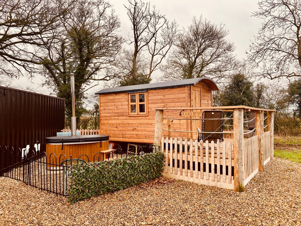 Afaste-se de tudo quando ficar sob as estrelas. Situado em Newlands Staycations, Grundisburgh Suffolk. 🐏 Rams Rest acomoda2 (1 cama de casal). A Cabana inclui mesa de consola e banco, torradeira de chaleira, fogão a gás duplo e um Air Fryer. Churrasco no exterior (aconselhável a ser o seu próprio carvão) e uma banheira de hidromassagem a lenha. 🐾 A nossa cabana também aceita animais de estimação. Sanita de🚽 campismo no interior da cabana e acesso 24 horas ao chuveiro e ao bloco da sanita. 🚿