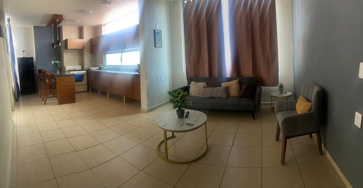 Desfrute de uma experiência única neste alojamento recentemente remodelado, localizado no coração de Tepatitlán, a apenas três quarteirões da praça principal. O espaço oferece Wi-Fi, uma Smart TV de 43", ar condicionado e uma cozinha totalmente equipada. Possui dois quartos com camas queen-size e duas casas de banho completas. Com a sua excelente localização, estará perto do centro da cidade e do bar e da área de entretenimento. Estamos muito contentes por recebê-lo e proporcionar uma estadia confortável e conveniente.