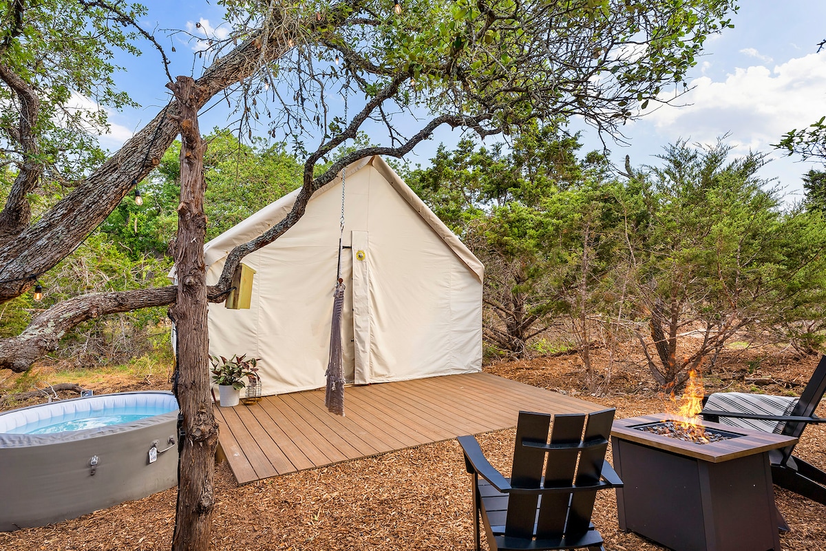 ✧Safári isolado de 5 acres: um retiro aventureiro dentro de um refúgio de animais exóticos de 1700 acres. Tenda de✧ acampamento de luxo: Totalmente isolada, com ar condicionado e aquecimento para conforto durante todo o ano. Acesso ao✧ rio a apenas 3,5 km da tenda: local privado no rio Lampasas para pesca, caiaque BYO e observação da vida selvagem. ✧Observação de estrelas em uma zona de céu escuro: relaxe sob as estrelas do Texas com redes, assentos no convés e uma lareira. Conforto ✧sustentável fora da rede: alimentado por 95% de energia solar, com carregamento de veículos elétricos de nível 2 e água da chuva purificada quente e fria.