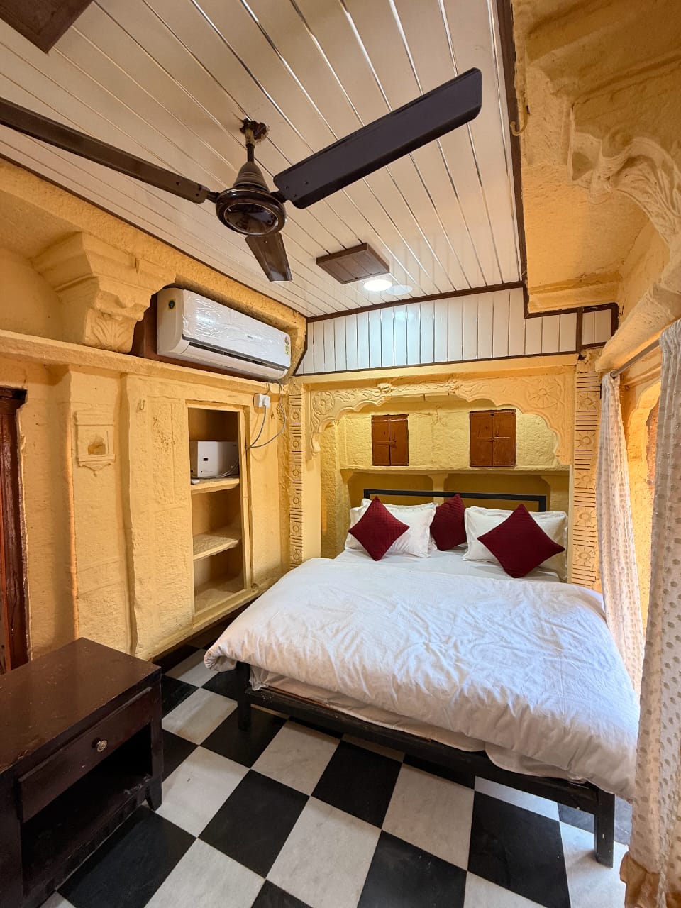 Fique no nosso quarto espaçoso e lindamente decorado, perfeito para 2 ou 3 hóspedes. Desfrute de uma decoração elegante com cortinas estampadas, tecidos artesanais e um ambiente branco quente que cria uma vibração tradicional do Rajastão. As comodidades incluem uma cama macia e acolhedora, uma casa de banho grande e uma tradicional jharokha de pedra. Os espaços comuns são um bónus. Orgulhamo-nos da limpeza, da hospitalidade calorosa e da comida deliciosa. Localizado no coração de Jaisalmer. Também organizamos passeios turísticos locais, safaris no deserto e estadias mágicas nas dunas