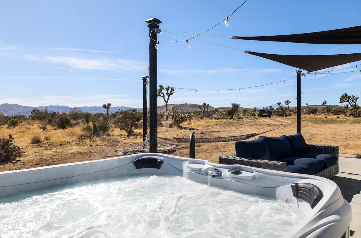 Welcome to Nebula Nest — a brand-new (2025) luxury tiny home set on 2 private acres in Joshua Tree. Designed for couples seeking something intimate, elevated, and unforgettable. Dark, moody interiors contrast beautifully with open desert skies. Wake to mountain sunrises, wind down by the fire at sunset, and soak beneath the stars in the in-deck hot tub. Romantic, secluded, and perfectly sized for two. Just 15–20 minutes from Joshua Tree National Park.