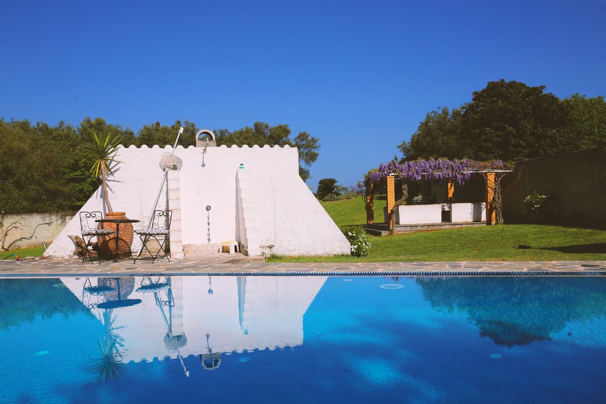 Pensão para famílias de 2 a 4 pessoas, ideal para quem ama a natureza e a tranquilidade. Situada em 3 hectares de relvado, na região de Gastouri, a 7 km do centro da cidade e a 10 minutos da praia mais próxima. É composta por uma cozinha, banheiro, quarto com sótão no espaço do quarto e piscina privativa. A anfitriã mora na casa ao lado e pode ajudá-lo em tudo o que precisar. Fora do espaço, há animais de estimação e uma pequena fazenda com galinhas e uma horta.