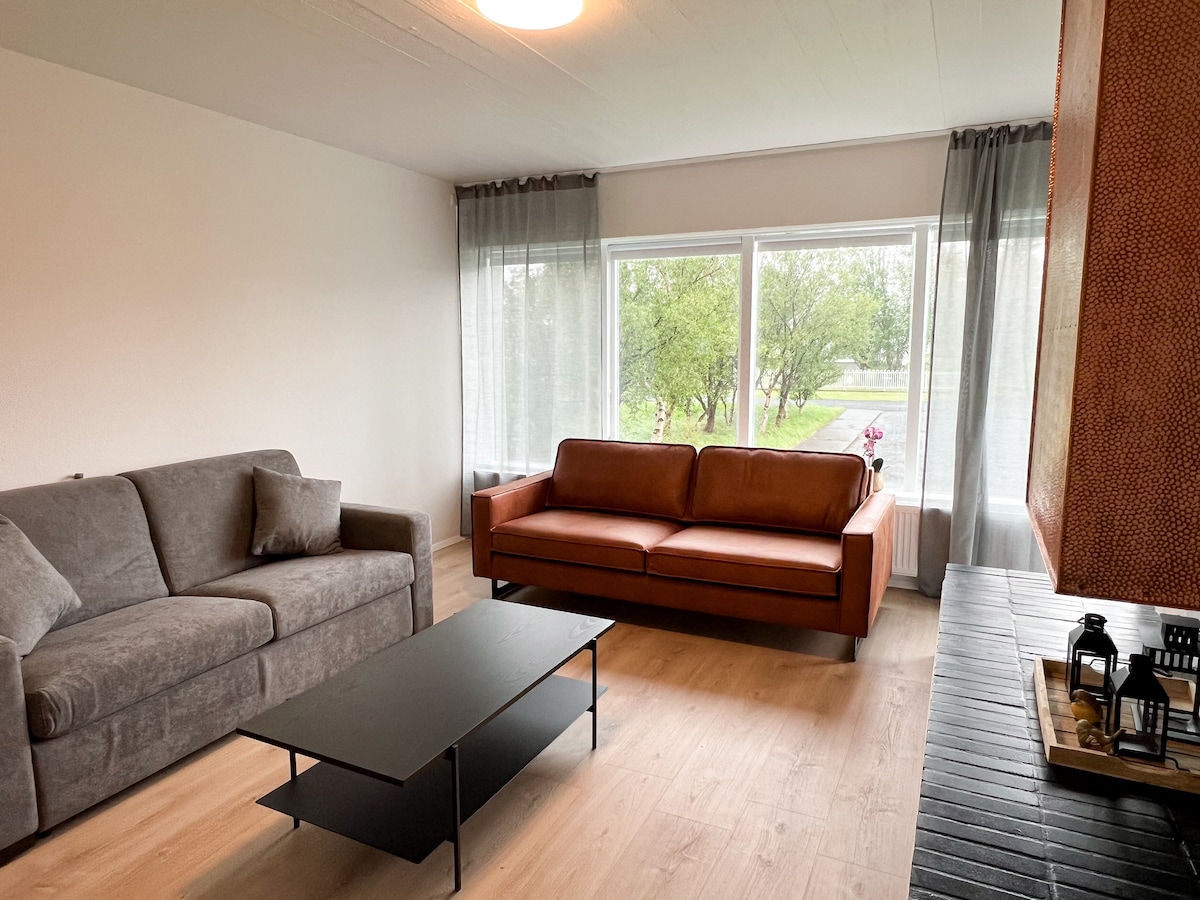 Welcome to our spacious and modern 120 m² apartment, offering a perfect balance of comfort and convenience. With 4 fully furnished bedrooms, a generous living room, a fully equipped kitchen, and one bathroom, this apartment offers everything you need for a relaxing and enjoyable stay. Located in the peaceful environment of Eiðar, only 14 km from Egilsstadir.