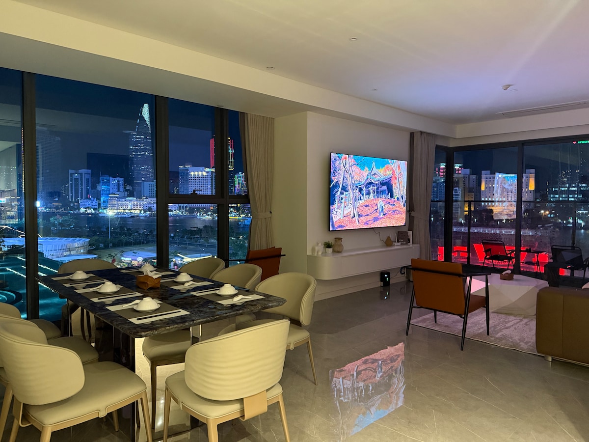 Apartamento DE LUXO - 1 Quarto. Com uma vista brilhante para o rio e para a cidade à noite, totalmente equipado com móveis acolhedores e utensílios de cozinha completos adequados para clientes que gostam de cozinhar durante o trabalho. A localização central, a apenas 5 minutos do Distrito 1 através da ponte Ba Son, mudando-se para atrações turísticas, museus, mercado Ben Thanh, rua a pé Nguyen Hue, Bui Vien. Perto de muitas casas de cavernas O apartamento de classe mais alto Ho Chi Minh. Fica a apenas 5 minutos a pé do 1º distrito. Fácil de pensar em mudar-se.