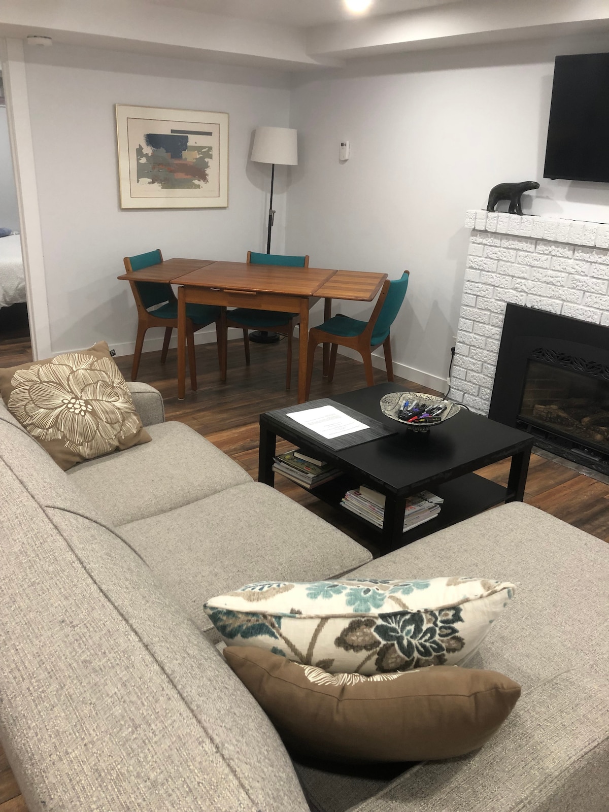Aproveite sua estadia em um apartamento no porão recentemente reformado com sauna, entrada separada e grande sala de estar. Inclui uma cama de casal, sofá-cama, chuveiro grande, lareira e máquinas de lavar roupa. Localizado a 5 minutos de carro do aeroporto em uma rua tranquila e circular. A poucos minutos de muitos restaurantes fast food, mercearias e todas as outras comodidades. Estacionamento na rua disponível.