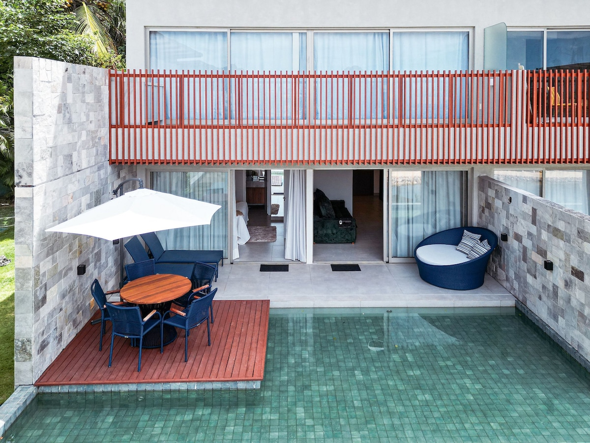 Um flat exclusivo projetado para aqueles que buscam uma experiência luxuosa em Pipa. Situado no primeiro andar, este espaço primorosamente projetado oferece o equilíbrio perfeito entre elegância e conforto. O flat é um refúgio íntimo, com uma varanda privativa que proporciona momentos de relaxamento com vista para a piscina. Cada detalhe deste espaço foi cuidadosamente pensado para criar uma atmosfera de luxo, proporcionando aos hóspedes uma experiência inesquecível em Pipa.