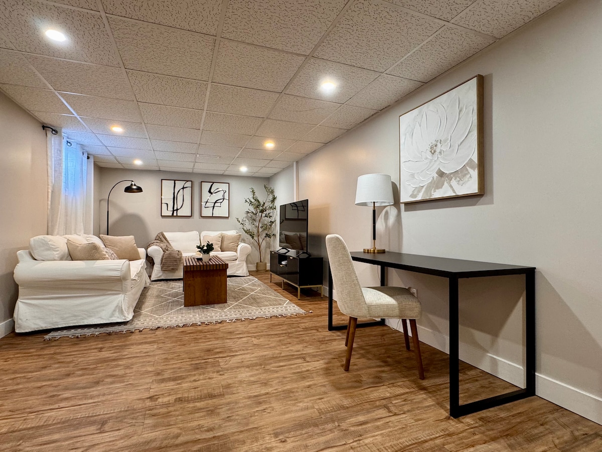 Caloroso e acolhedor, este espaço foi criado com uma ideia em mente, CONVENIÊNCIA. Há lavandaria no local, estacionamento, bem como uma cozinha totalmente abastecida e casa de banho. O sofá converte-se numa cama para um hóspede extra e há roupa de cama extra para o sofá no compartimento de arrumação.