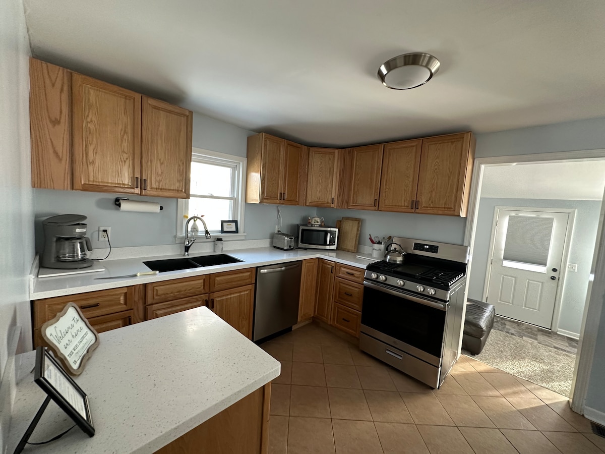 Welcome to this updated home just 1.3 miles from Ross-Ade Stadium, perfect for your next West Lafayette visit. The main floor features a spacious living room with a 55" Roku TV, a dining area with seating for six, a fully equipped kitchen, 2 queen bedrooms with premium bedding, and a full bathroom. Downstairs, the finished basement offers a king bedroom, a second full bathroom, a large rec room with 55" TV, a futon, a game area with table and chairs, a laundry room, and a dedicated work area.