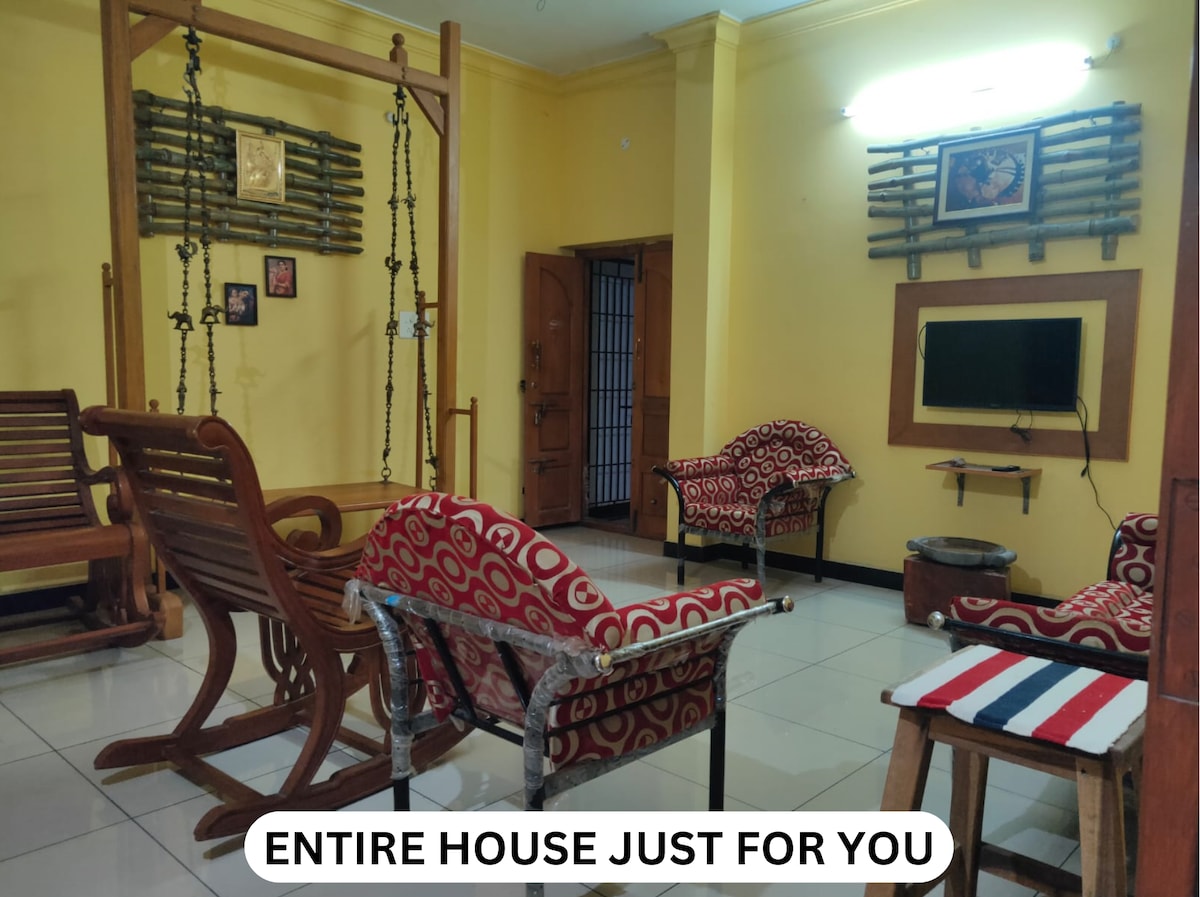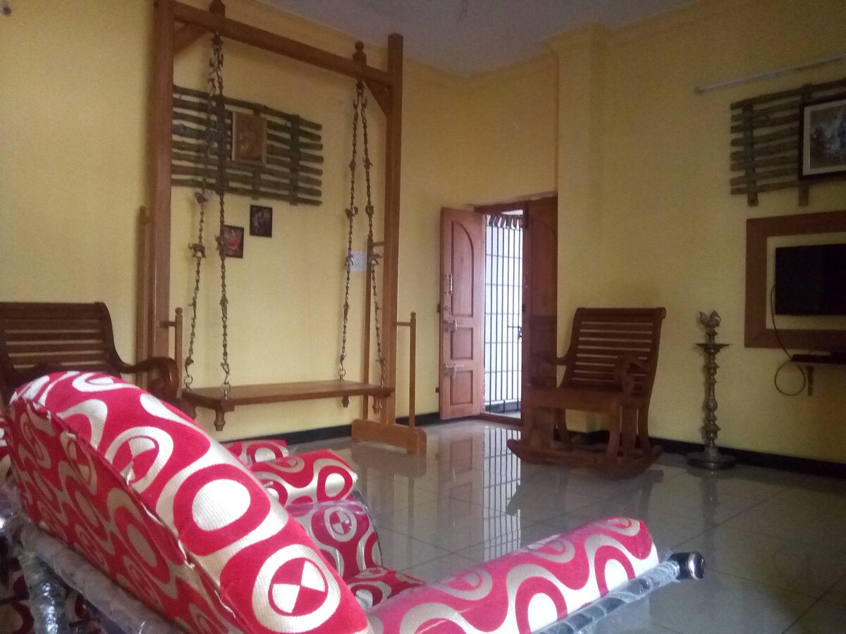 Moradia 3BHK recém-renovada, totalmente mobilada e acolhedora em Trichy. Perfeita para famílias, amigos ou uma viagem de negócios. Dispõe de uma espaçosa sala de estar, 3 quartos confortáveis com ar condicionado e casas de banho modernas, Wi-Fi de alta velocidade, água RO, câmaras de segurança, estacionamento, check-in autónomo. Acomoda confortavelmente até 8-10 adultos e 2-4 crianças. Perto das principais atrações: Srirangam, Tiruvanaikovil, Samayapuram, Aeroporto, Estação ferroviária, Nova estação de autocarros de Panjappur. A propriedade é limpa, segura e ideal para viagens curtas e longas.