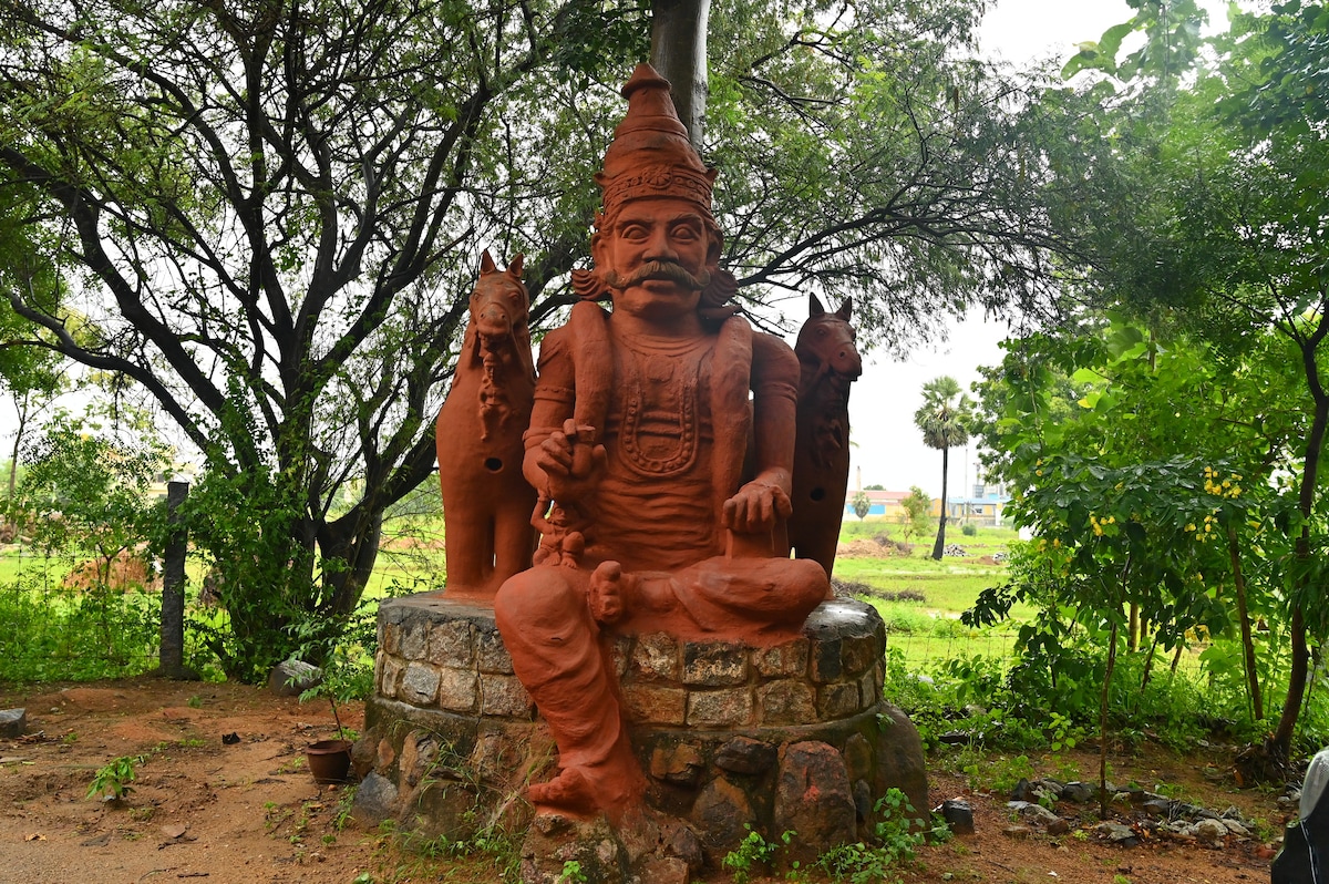 Um Bungalow sereno e panorâmico com 3 quartos AC, dois grandes salões, cozinha, um quarto de escritório, todas as instalações para uma estadia acolhedora. A 1 km do ashram de Ramana, a 10 minutos do famoso Templo Lord Shiva, do templo Tiruvannamalai. Mais adequado para meditação, cura e visitas espirituais. O melhor espaço para famílias também.