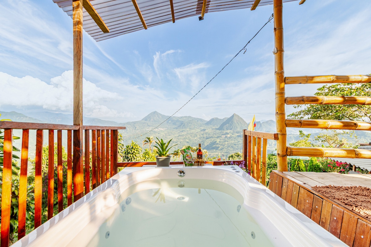 Relájate en esta acogedora cabaña rodeada por tierras cafeteras, de naturaleza y tranquilidad. Cuenta con cocina dotada, habitación con cama doble y TV, baño abierto natural, sala exterior, jacuzzi, malla catamarán y zona verde. Además, dispone de wifi de 300 MB ideal para trabajar remoto o mantenerte conectado durante tu estadía. También ofrecemos servicio de alimentación adicional. Perfecta para escapadas románticas, descansar o combinar trabajo y naturaleza lejos del ruido de la ciudad.