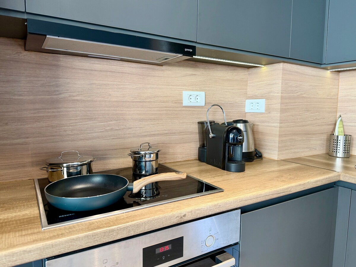 Relaxe num apartamento moderno de 1 quarto em Mazina, Tivat, a apenas 15 minutos a pé do mar e de Porto Montenegro. Desfrute de belas vistas para o mar, de uma piscina partilhada, de uma sauna e de um estacionamento privado. O apartamento de 36 m² tem uma cozinha totalmente equipada, ar condicionado e acesso à Internet de alta velocidade. Perfeito para casais, viajantes solitários ou trabalhadores remotos que procuram conforto, conveniência e um toque de luxo costeiro.