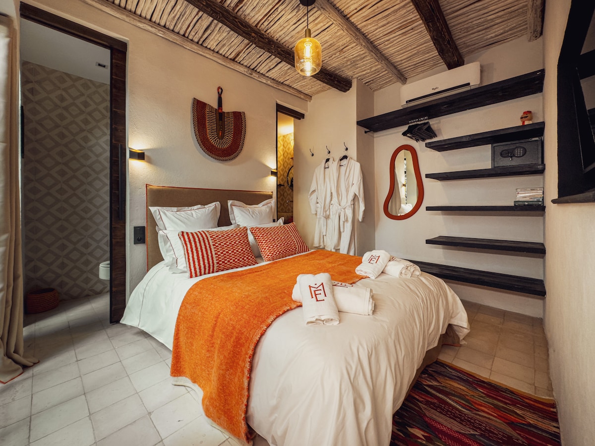Hospede-se no coração de Marraquexe em nosso apartamento de 2 quartos e 2 banheiros. Desfrute de uma cama Simmons de alta qualidade, Wi-Fi de alta velocidade (fibra ótica) e decoração moderna com um toque étnico. Cozinha totalmente equipada, banheira elegante e chuveiro italiano. A poucos passos da Praça Jemaa el-Fna, do Plazza e do Carré Eden. Observação: casais marroquinos não casados não são permitidos.