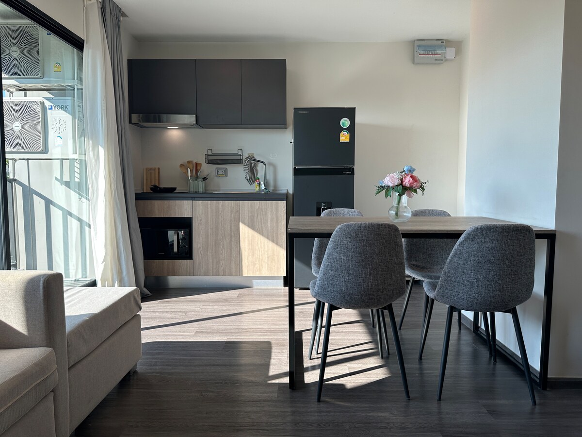 Pode escolher e ficar no meu apartamento e espero que tenha uma ótima viagem à Tailândia. A casa está localizada em RAMA9, apartamento LOFT entregue em 2024.O tamanho do quarto é de cerca de 40 metros quadrados, incluindo um quarto, uma sala de estar e sala de jantar, uma cozinha e uma casa de banho, que pode facilmente acomodar 3 adultos. (dicas: 1 cama no quarto quando a reserva é de 1-2 pessoas, se precisar de adicionar um sofá-cama, por favor preencha o número de pessoas como 3 no momento da reserva, e informe-nos especialmente após a reserva que providenciaremos para que a equipa faça o sofá-cama antes de fazer o check-in) O preço da reserva inclui o uso de toda a propriedade, bem como o custo do centro de fitness, da piscina e do espaço de co-working.