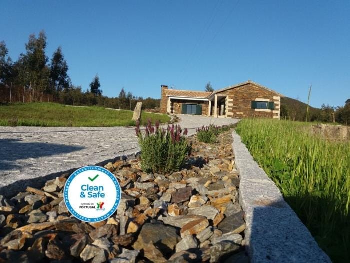 Casa para grupos, com piscina e jardim, 4 quartos e 2 estúdios, todos com casa de banho privativa, sala de estar e jantar, cozinha equipada, todos com ar-condicionado, numa pacata aldeia. Wi-Fi grátis, bicicletas, churrasqueira e forno a lenha e estacionamento privativo. Para grupos até 8 hóspedes (+ 2 berços): peça para reservar apenas o edifício principal, de granito, com preço reduzido. Disponível meio setembro a meio junho.