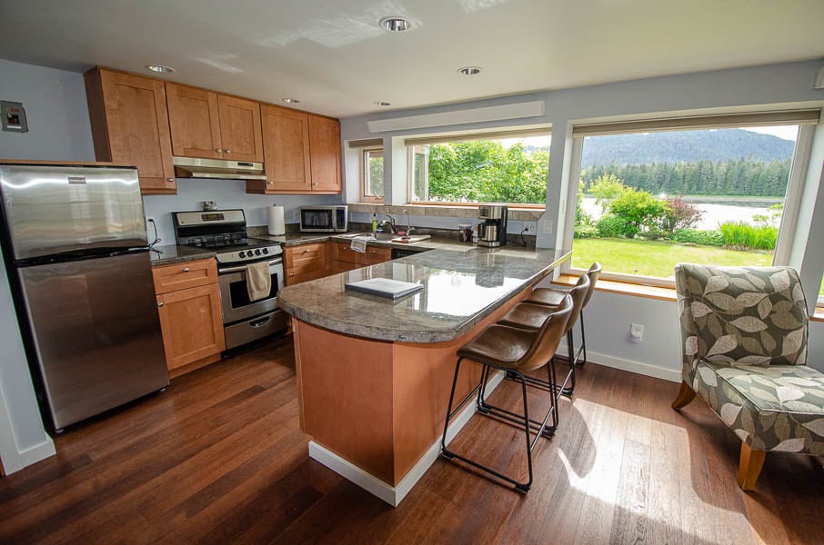 **June 2026 there will be roofwork Monday-Thursday and may be daytime noise / workers present. We have blocked those days but can open if requested.** Driftwood Palace is a recently renovated 1 bedroom / 1 bathroom waterfront guest suite. A short 5 minute drive from downtown Petersburg, but feels a world away with water views from nearly every room. The West-facing covered porch is just feet from the Wrangell Narrows, and is great for watching sunsets, wildlife, and boats.