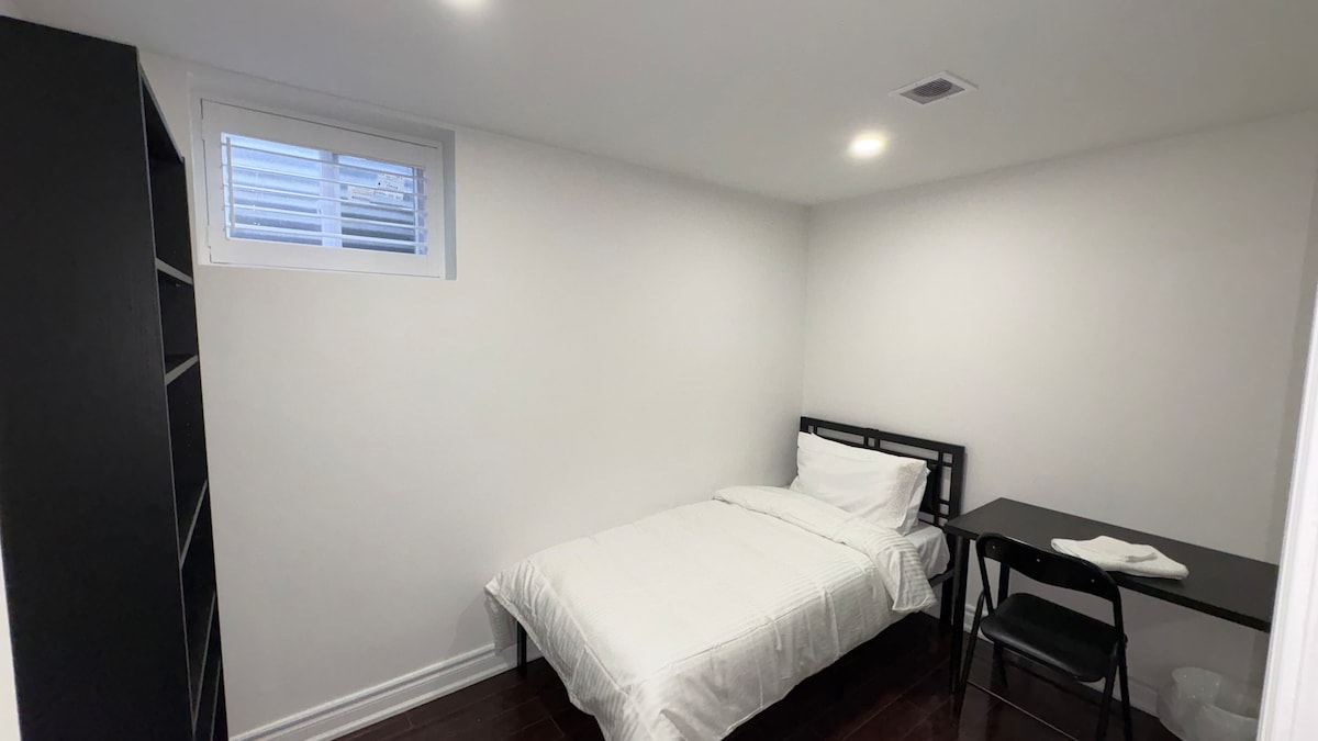No 3rd party booking! No parties! No visitors! ARRIVING W/ EXTRA GUEST WILL GET CHARGED DOUBLE! Smokers are not welcome! Bright and cozy basement 1 room 1 bathroom, perfect for a comfortable stay. Enjoy high-speed 1Gbps WiFi, a plush queen-sized bed, and closet space. A private living room area with a 43-inch Google TV. A workspace equipped with a desk, lamp and whiteboard, along with thoughtful touches like a fan and essentials on the desk.