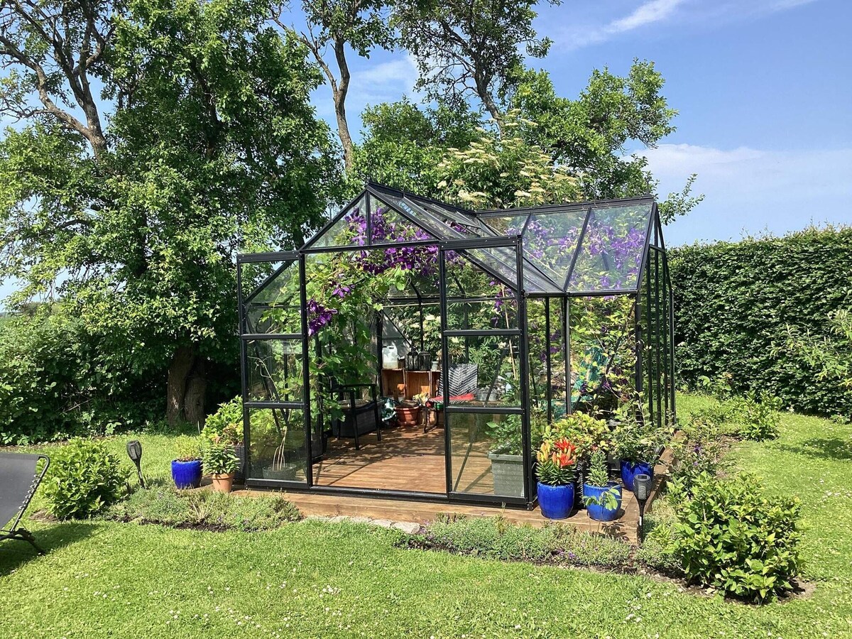 Primeira fila para a água - cais e sauna. Linda casa de veraneio de madeira dos anos 50 bem conservada em preto com janelas brancas. Pátio de árvores de inspiração sueca, com as ervas mais maravilhosas. Jardim enorme com pequenas casas encantadoras, durante a noite para um total de 4 pessoas . Escolha-se a partir da casa de campo junto à vinha no quintal ou o quarto na casa principal diretamente para o quintal das árvores. Fique num belo pomar de maçãs, com pavilhão de crianças na árvore e redes. Mantenha os eventos de jantar protegidos, no grande deck de madeira. Projetor de sala de estar