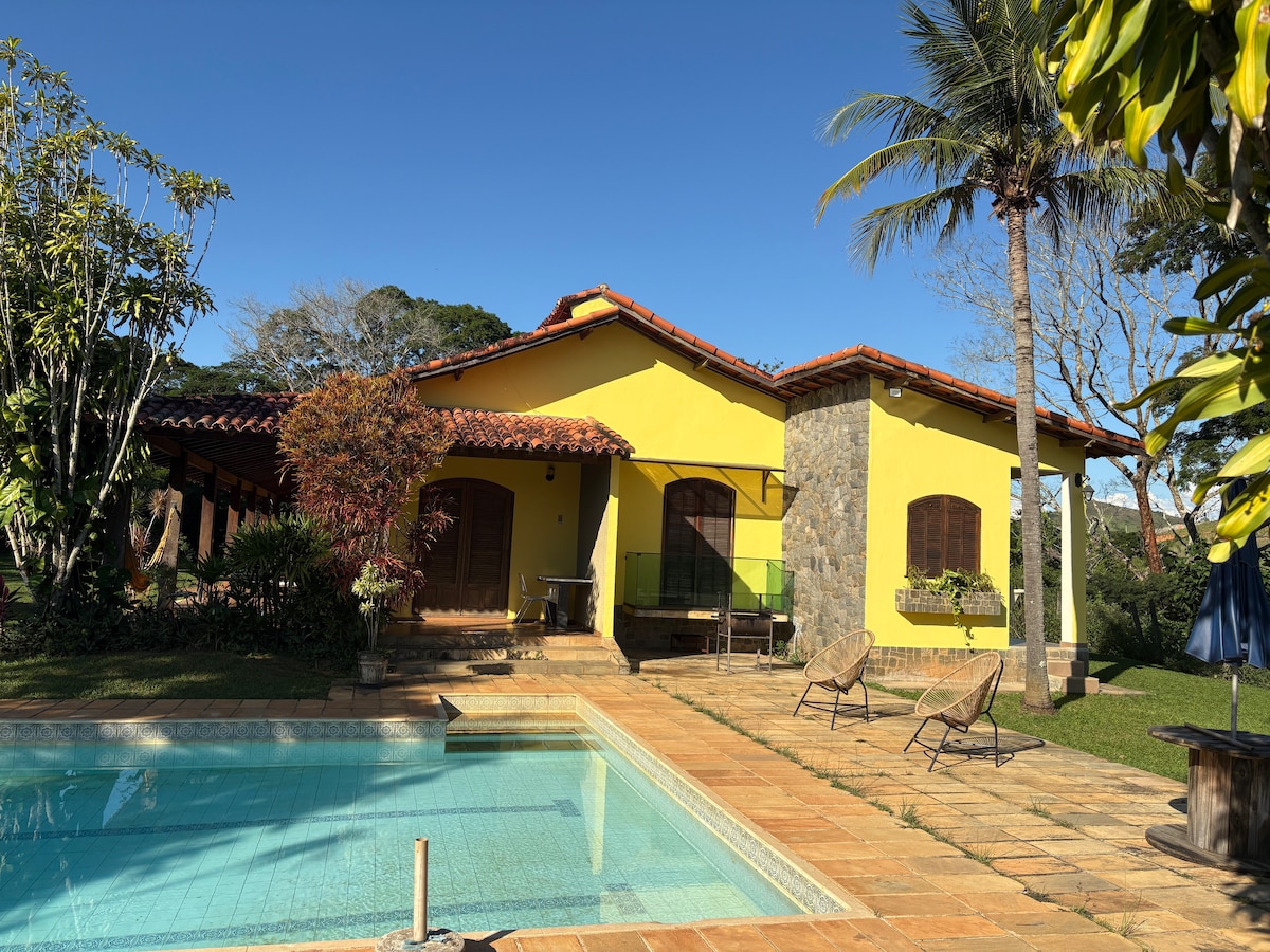 Refúgio acolhedor onde conforto e natureza se encontram em Condomínio fazenda na região serrana em Areal, 4 km do Borgo Del Vino. Excelente casa charmosa e confortável estilo fazenda com linda vista para as montanhas e muito verde ,com varandao ,salão com lareira , sala jantar mesa 10 lugares, cozinha completa e adega , área de serviço, três quartos sendo uma suíte, todos com ventilador de teto e ar condicionado. Área externa privativa com piscina, ducha , espaço Goumert com churrasqueira .