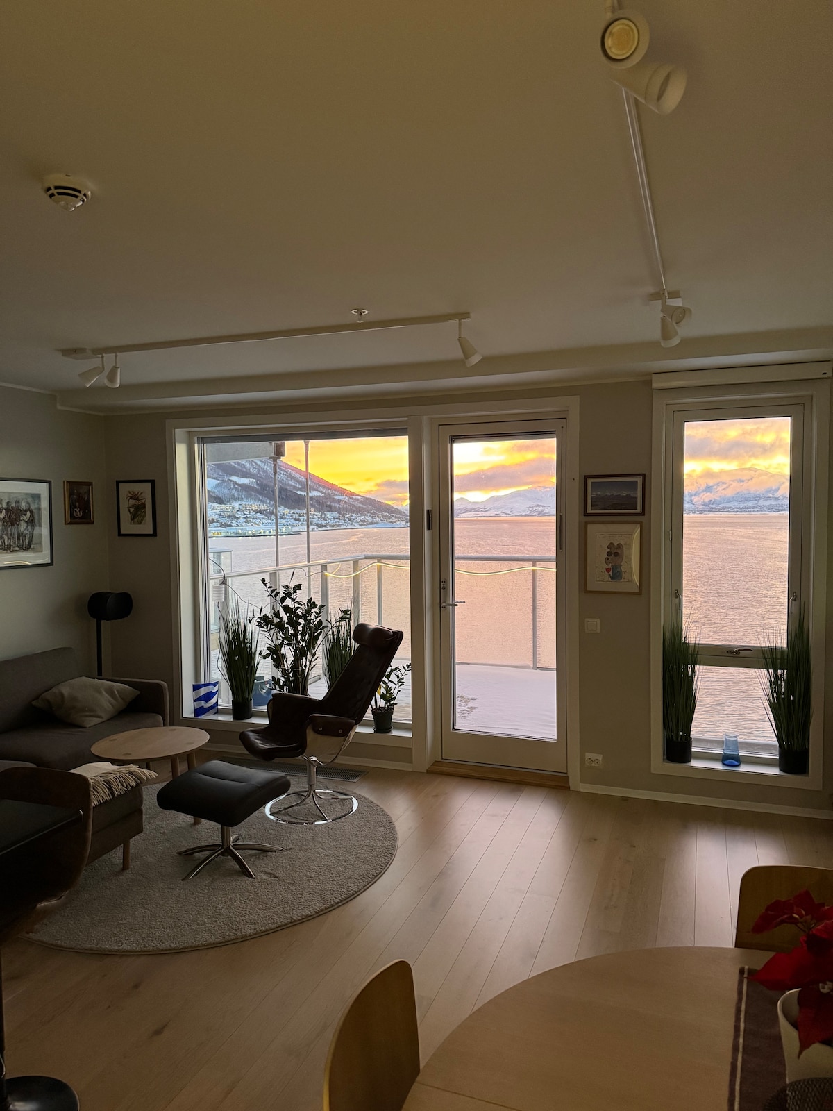 Toppleilighet med fantastisk utsikt! Sentrumsnær og moderne leilighet på Tromsøya. Fra terrassen kan man både se nordlys og midnattssol. Leiligheten består av stue, kjøkken, bad, gang og 3 soverom. Det er parkeringsplass inkludert i leien rett utenfor. Det er busstopp ca. 50 meter fra leiligheten. Buss nr. 24 går direkte fra flyplassen. Gangavstand til sentrum- ca. 15 min. Leiligheten er fult utstyrt med alt man trenger til både korte og lange opphold.
