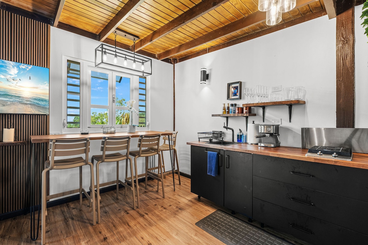Espaço único e relaxante com céus grandes e camas aconchegantes. À procura de um refúgio intimista onde não possa fazer nada além de relaxar, reequilibrar e reabastecer-se. A apenas 30 minutos do aeroporto de SJU. Este espaço único foi concebido para estar em casa longe de casa, por isso encontrará todas as comodidades de que precisa para se sentir confortável e relaxar. Nota - Ar condicionado adicionado em fevereiro de 2025. Temos um gerador de energia e uma cisterna de água. A temperatura máxima da banheira de hidromassagem é de 85 graus, se a energia acabar, levará tempo para aquecer novamente.
