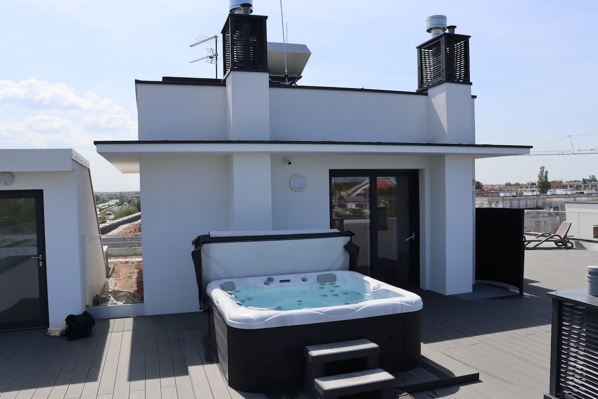 Desfrute de uma experiência elegante como se estivesse em um navio de cruzeiro. O edifício tem a forma de um navio de cruzeiro, no terraço há uma sauna (aberta o ano todo) e uma banheira de hidromassagem aquecida (maio a setembro) e espreguiçadeiras para relaxar. No subsolo está localizada a grande academia de ginástica, com ar condicionado. O apartamento no térreo também inclui um jardim de aproximadamente 30 m². Estacionamento privativo gratuito, com vigilância por vídeo no local. Localização no porto, a praia principal fica a cerca de 15 minutos a pé