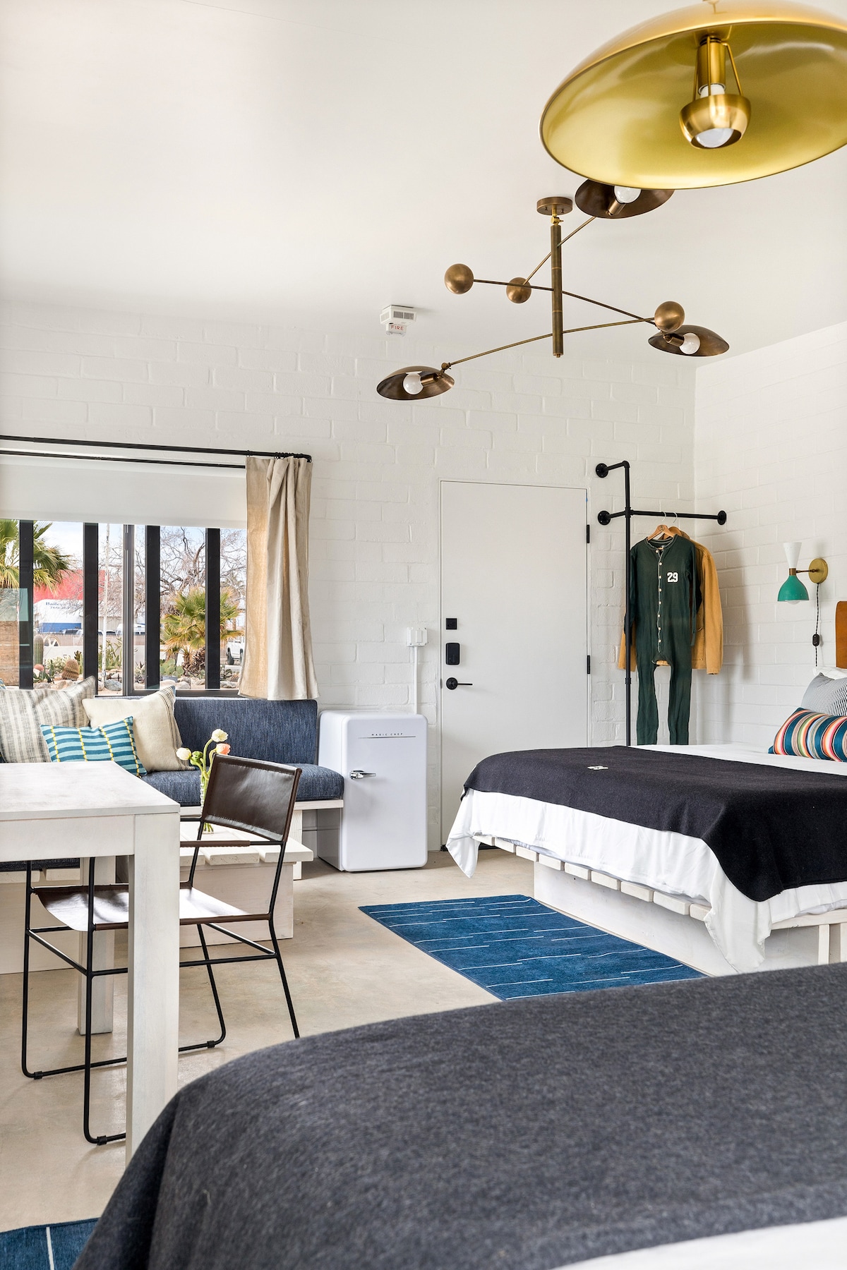 O quarto 4 adora receber hóspedes e exibir-se. Ela inclui uma cama queen, cabeceira vintage acolchoada, banco de abeto branqueado, fronhas personalizadas, luminárias originais e uma secretária com cadeira se precisar de trabalhar. O Ramsey 29 é como um Onde está o Wally do mundo dos motéis. Veja quantos detalhes escondidos consegue detetar. Um motel de design nas proximidades de Joshua Tree. Acorde com a luz do deserto a entrar, desfrute das melhores caminhadas e termine a noite com deliciosa comida e cocktails no Kitchens Dessert.