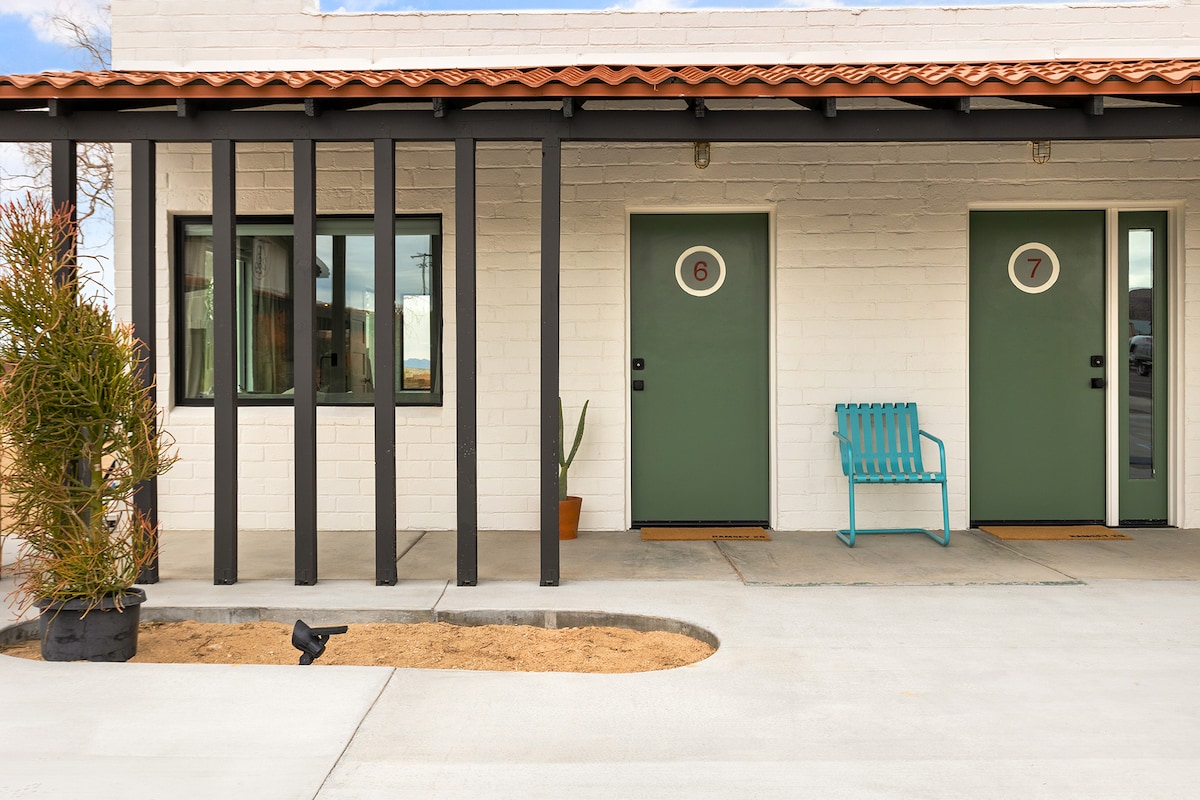 O King Apartment 6 é um espaçoso retiro de 360 pés quadrados/33 m2 com uma cama king size, assentos personalizados, televisão de moldura e uma kitchenette. A casa de banho inclui um chuveiro de latão não lacado, produtos de higiene pessoal premium e os nossos pisos de 29 azulejos exclusivos. Um motel de design nas proximidades de Joshua Tree. Acorde com a luz do deserto a entrar, desfrute das melhores caminhadas e termine a noite com deliciosa comida e cocktails no Kitchens Dessert.