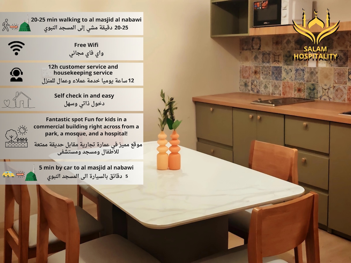 استمتع بتجربة سفر رائعة في هذا المسكن المتميز، يقع هذا المسكن الخاص بالقرب من الحرم النبوي ومسجد قباء بمسافة 5 دقائق فقط بالسيارة، يتوفر بالقرب من المسكن جميع الخدمات الأساسية والمطاعم الشعبية العريقة المشهورة في المدينة المنورة. يتميز هذا المسكن بـ : - غرفة نوم واسعة بسرير مزدوج ومريح. - شاشة ذكية 65 بوصة - بار صغير مزود بـ (غلاية كهربائية، مايكرويف، ثلاجة) - دورة مياه مع جميع مستلزماتها - واي فاي - مصعد