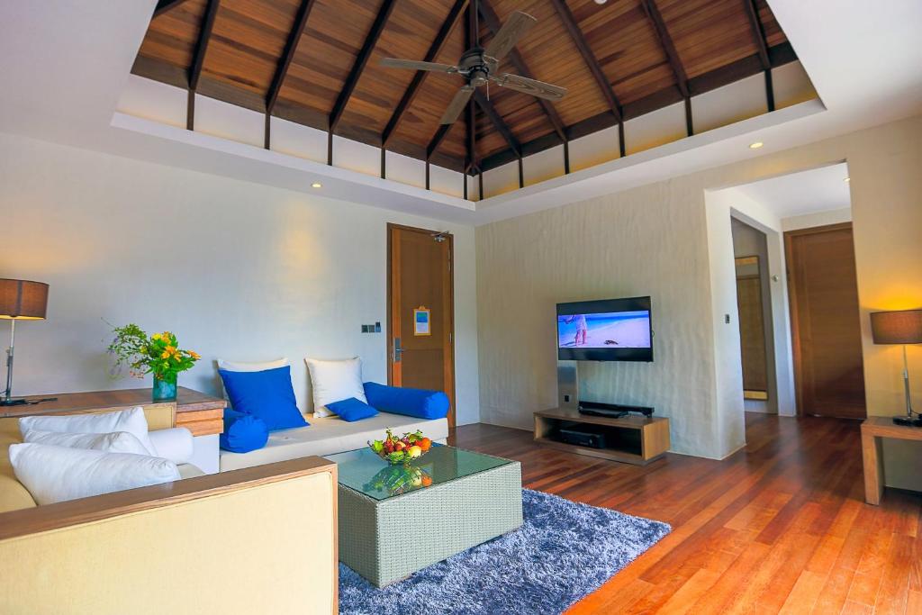 At the huge villa over water with private pool peace and quiet are guaranteed at the villa because space and privacy are built into the very essence of this paradise > Entire Water villa in a 5 star private island > Private pool > 2 Adults & 3 Child > 190 SQM > Split stay in different types of villa possible > Meals, Excursion Airport Transfer ( additional charges Apply ) Kindly ping me before sending reservation request to arrange transportation to & from MLE Airport