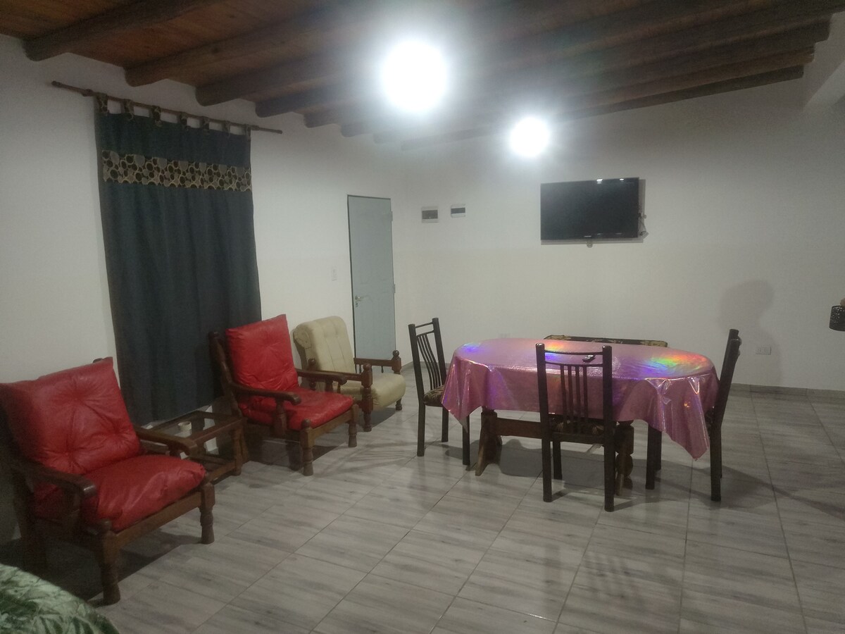 Apartamento no rés-do-chão, um quarto, casa de banho com bidé, cozinha-sala de jantar, armário, aquecedor de água de tanque elétrico, micro-ondas, forno elétrico e chaleira, fogões, pratos, máquina de lavar roupa, frigorífico. Internet Wi-Fi, ar condicionado quente e frio em dois quartos. Câmaras de segurança, garagem, portão deslizante automático, 2 beliches de madeira, sofá, lençóis, toalhas, grelhador. Smart TV 43'', ferro de engomar, secador de cabelo. A 20 minutos do circuito Villicum. A 5 minutos da propriedade Costanera. Paragem de ônibus na portaria