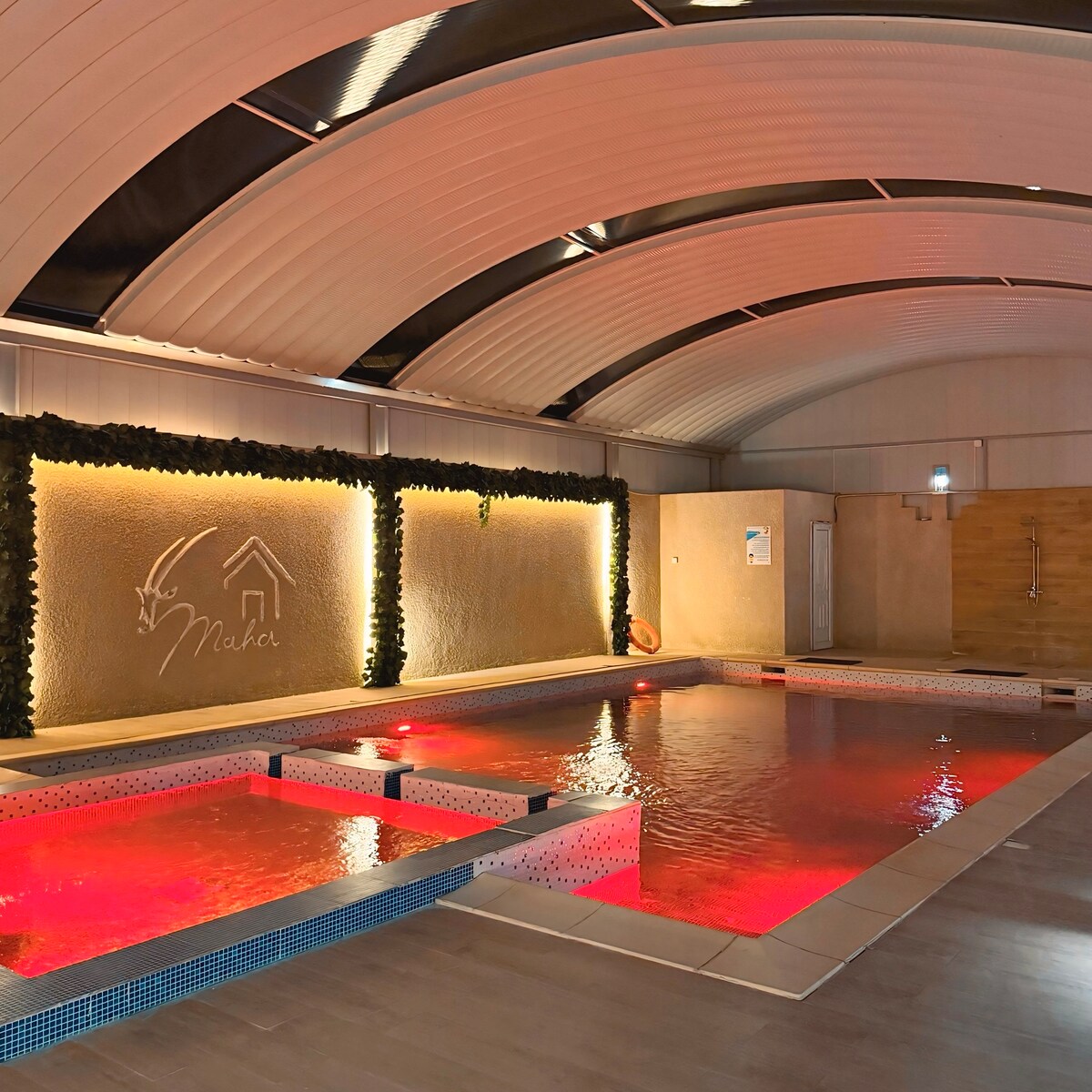 This villa is perfect for family time and close friends. It’s quiet and away from the city so you can slow down and enjoy being together. It has 5 bedrooms with queen and king beds, a kids play room, billiards and foosball, and two heated indoor pools for adults and kids. Outside, you’ll find a BBQ area, small playground, and a private majlis to relax, drink tea, and unwind.
